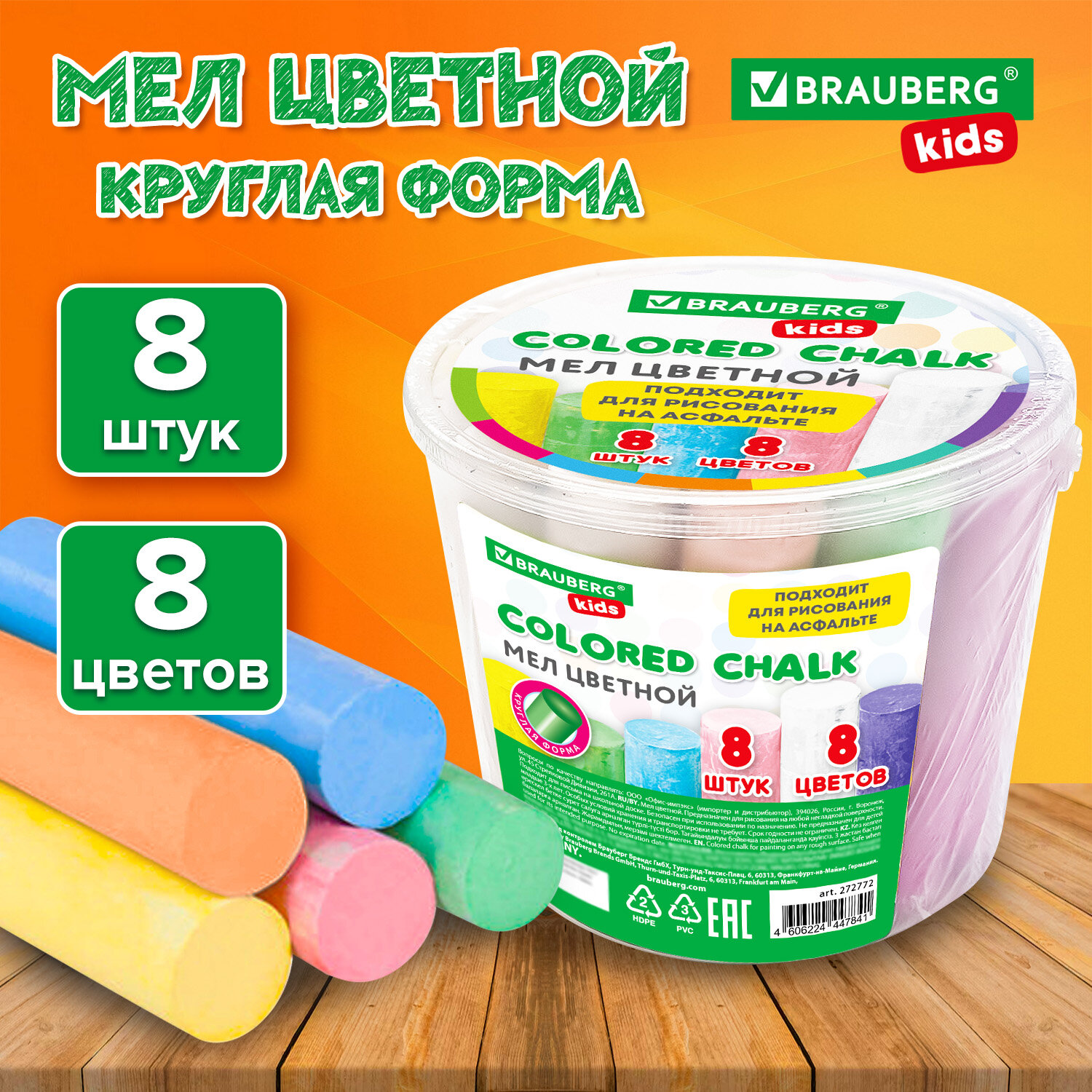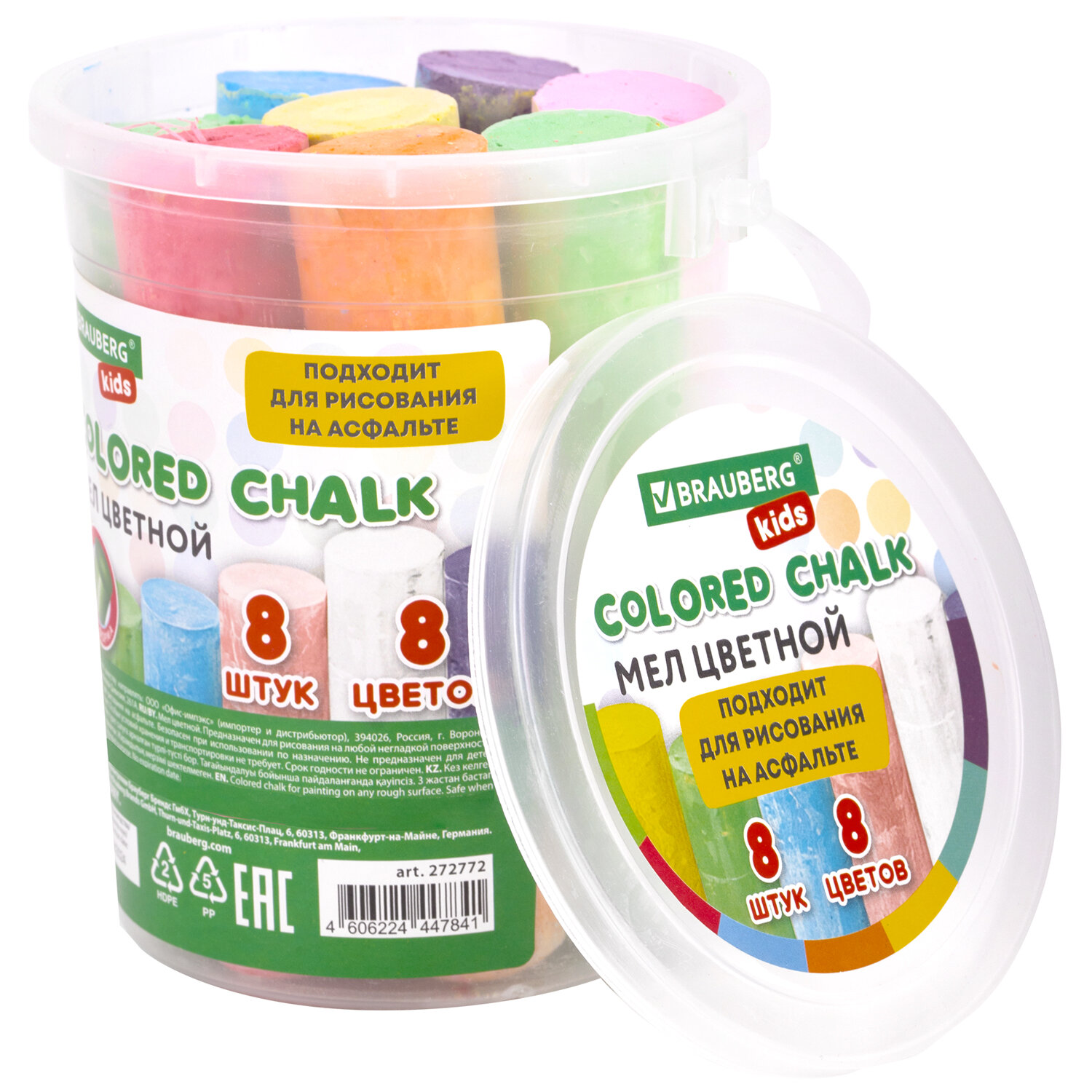 - Мел в ведерке для рисования на асфальте 8 штук, цветной круглый, BRAUBERG KIDS, 272772