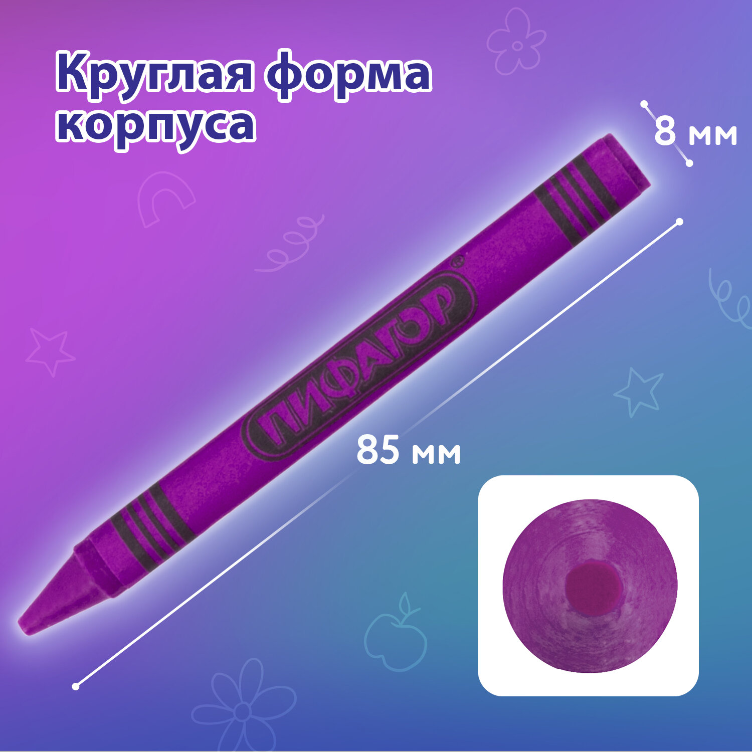 Палитра состоит из 12 ярких и насыщенных цветов. Полностью безопасны в использовании, не токсичны и не имеют резкого запаха. Благодаря своему составу мелки пишут мягко, и ребенку не придется прикладывать усилия в процессе рисования. Круглая форма корпуса и диаметр 8 мм делают их удобными для тренировки руки к письму у дошкольников и детей младшего школьного возраста, формируют навык правильного захвата, снижают нагрузку на кисти рук. Каждый мелок завернут в бумажную этикетку, что предохраняет от загрязнений, снижает скольжение, увеличивает прочность. Восковые мелки упакованы в картонную коробку с европодвесом. Восковые мелки ПИФАГОР "СОЛНЫШКО", НАБОР 12 цветов, 227279