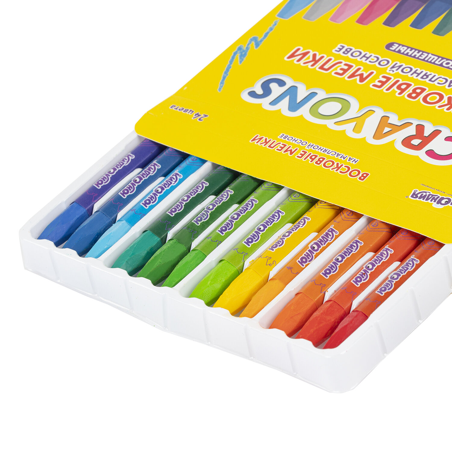 Палитра состоит из 24 ярких и насыщенных цветов. Мелки полностью безопасны в использовании, не токсичны и не имеют резкого запаха. Благодаря своему составу пишут мягко, ребенку не придется прикладывать усилия в процессе рисования.