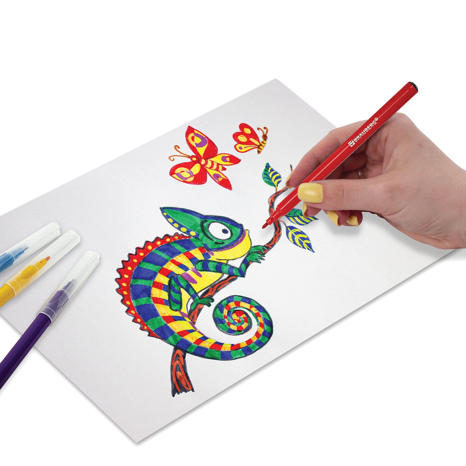 В наборе 36 фломастеров с круглым корпусом из пластика длиной 150 мм и диаметром 8,2 мм. Круглый наконечник из фетра с линией письма 0,5-1 мм удобен для создания тонких линий и прорисовки деталей. Длина письма составляет 350 м – такого расхода хватит надолго. Фломастеры изготовлены на водной основе, поэтому они безопасны и смываются с большинства материалов и кожи. Прозрачный колпачок имеет специальные прорези для вентиляции, которые способствуют прохождению воздуха при попадании в дыхательные пути малыша.