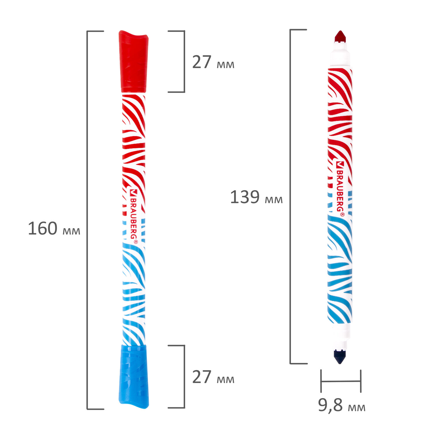Фломастеры имеют удобную круглую форму корпуса, длина которого 160 мм, а диаметр составляет 9,8 мм. Процесс раскрашивания становится приятным и увлекательным благодаря разноцветному двустороннему наконечнику с линией письма 1-3 мм и диаметром пишущего узла 4,6 мм. Фломастеры изготовлены на водной основе, поэтому практически не имеют запаха, не токсичны и легко смываются с большинства материалов и тканей. Фломастеры обладают экономным расходом чернил, при этом длина линии письма достигает 500 метров. Быстросохнущие чернила предотвращают смазывание рисунка. Благодаря полипропиленовому корпусу срок службы фломастеров значительно увеличивается, а вентилируемый колпачок не причинит вреда при попадании в дыхательные пути. Рекомендованы для детей от 3-х лет. Фломастеры двусторонние утолщенные BRAUBERG "PREMIUM" "BI-COLOR", 10 шт., 20 цветов, двухцветные, вентилируемый колпачок, 151945