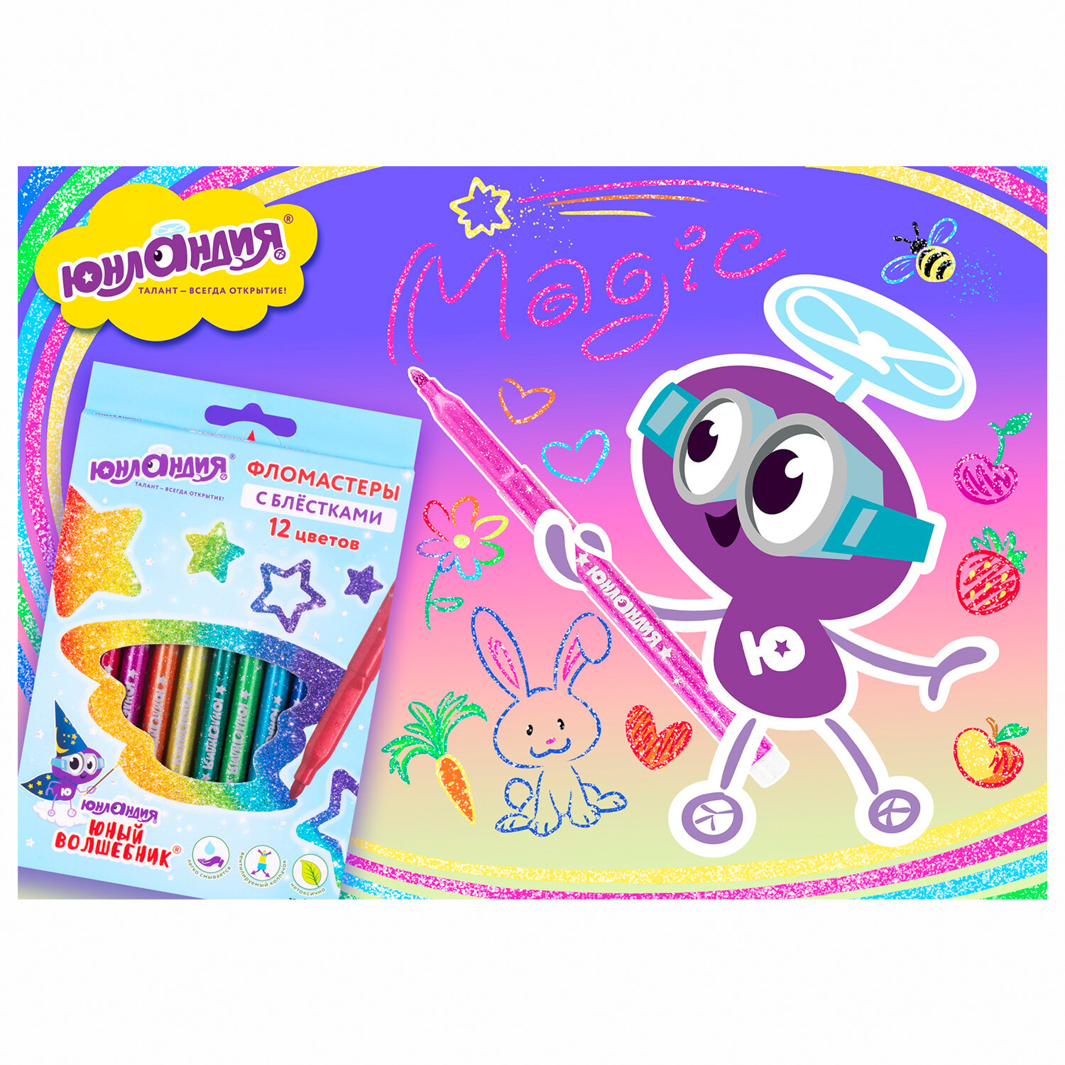 - Фломастеры с блестками ЮНЛАНДИЯ 12 цветов, "ЮНЫЙ ВОЛШЕБНИК", ударопрочный наконечник, вентилируемый колпачок, картон, 151650