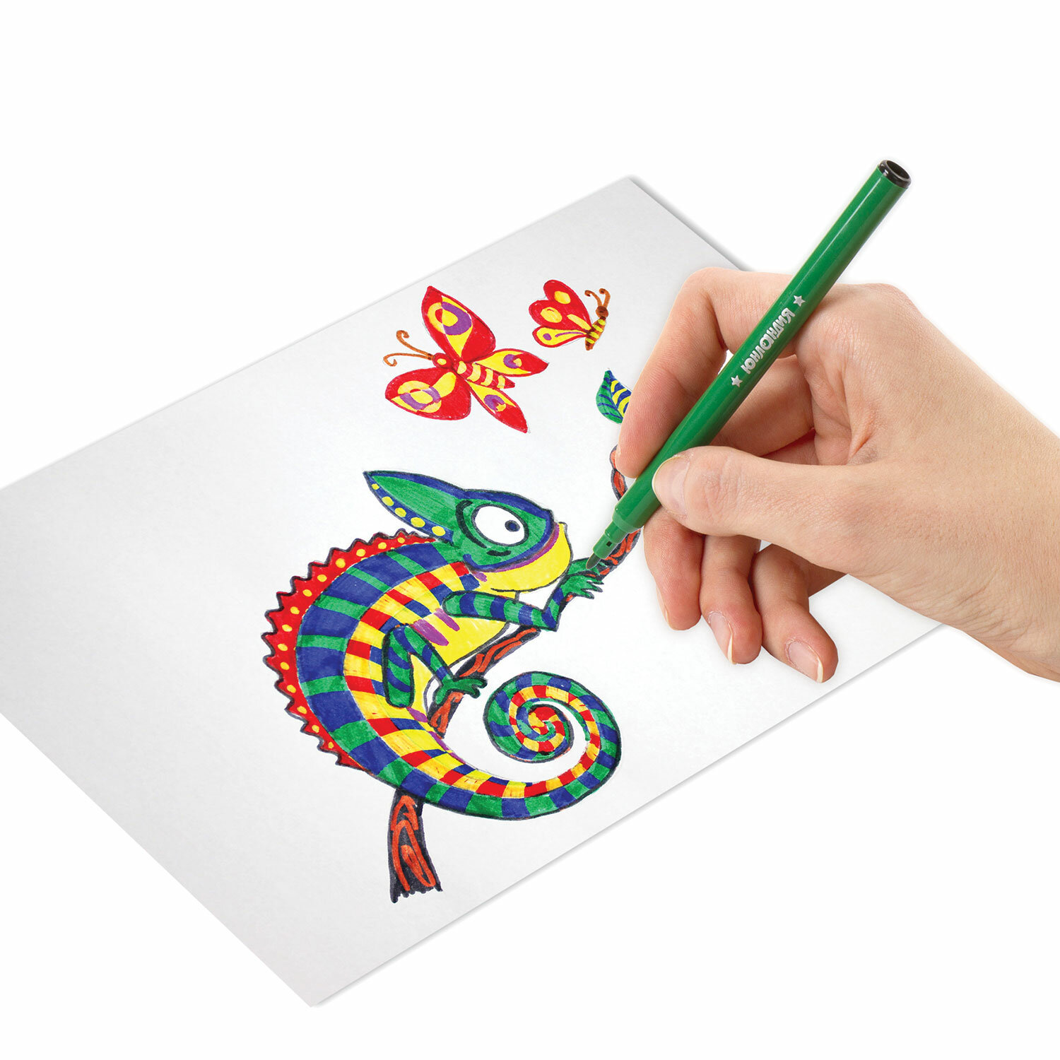 Обладают яркими насыщенными цветами в количестве 12 штук. Удобная круглая форма корпуса, длина которого 139 мм, а диаметр - 8,5 мм. Благодаря толщине линии письма 1 мм и диаметру пишущего узла 2,1 мм процесс раскрашивания становится легким. Длина письма составляет 600 м: такого расхода хватит надолго. Фломастеры изготовлены на водной основе, поэтому они безопасны и легко смываются с большинства материалов и кожи. Наконечник, устойчивый к продавливанию, не проваливается внутрь корпуса и не деформируется даже при сильном нажатии. Полипропиленовый корпус значительно продлевает срок службы фломастеров. Колпачок имеет специальные прорези для вентиляции, которые способствуют прохождению воздуха при попадании в дыхательные пути малыша. Рекомендованы для детей от 3-х лет. Фломастеры ЮНЛАНДИЯ 12 цветов, "ЗАБАВНЫЕ КАРТИНКИ", вентилируемый колпачок, картон, 151678