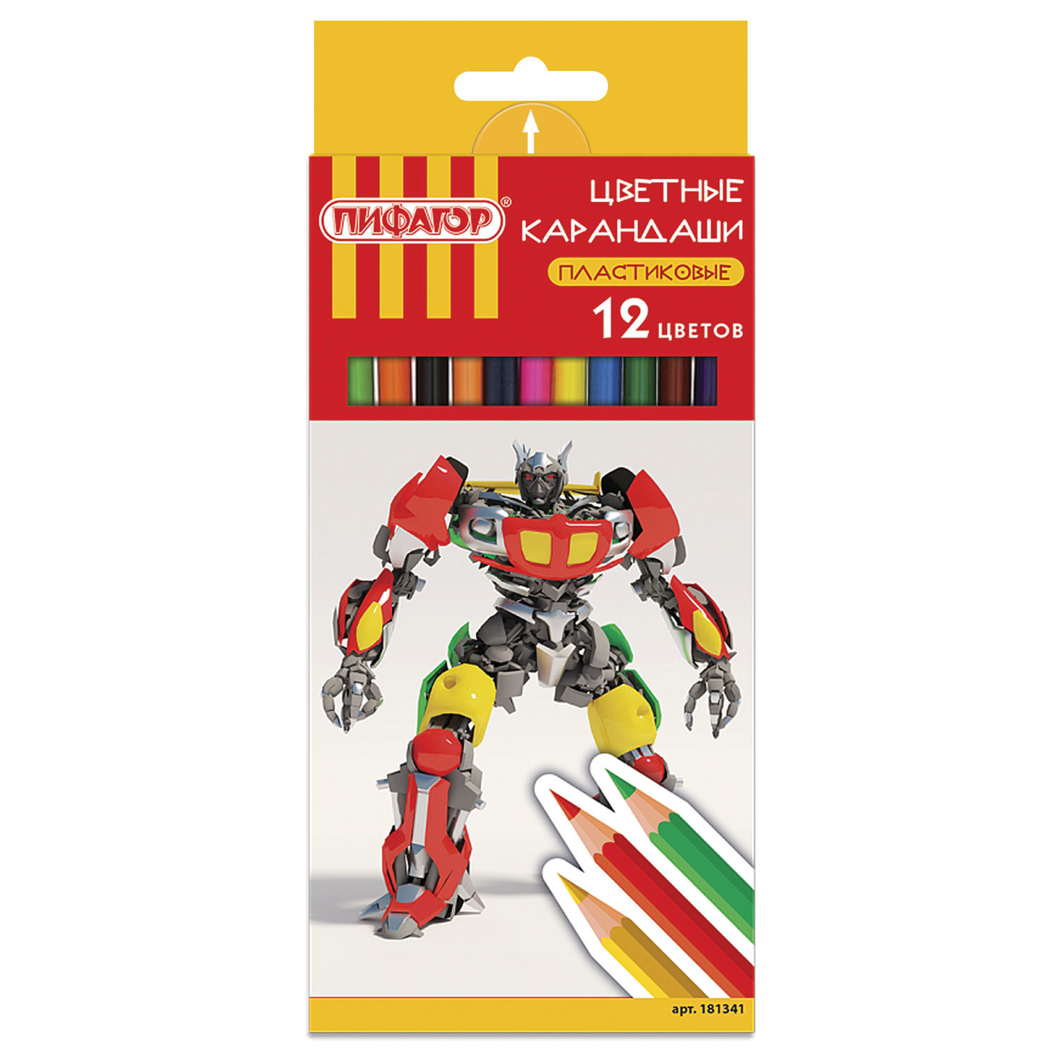 Набор состоит из 12 цветов: розовый, красный, желтый, оранжевый, салатовый, зеленый, голубой, синий, фиолетовый, коричневый, серый, черный. Шестигранная форма сечения корпуса позволяет карандашу не скатываться с поверхности стола во время занятий рисованием. Карандаши изготовлены из пластика и имеют лакированный корпус, который при разломе не образует острые края и безопасен для детей. Легко затачиваются. Грифель диаметром 2,65 мм обладает повышенной прочностью. Все карандаши заточены и поставляются в картонной упаковке с европодвесом. Карандаши цветные ПИФАГОР "БОЕВОЙ РОБОТ", 12 цветов, шестигранные, 181341