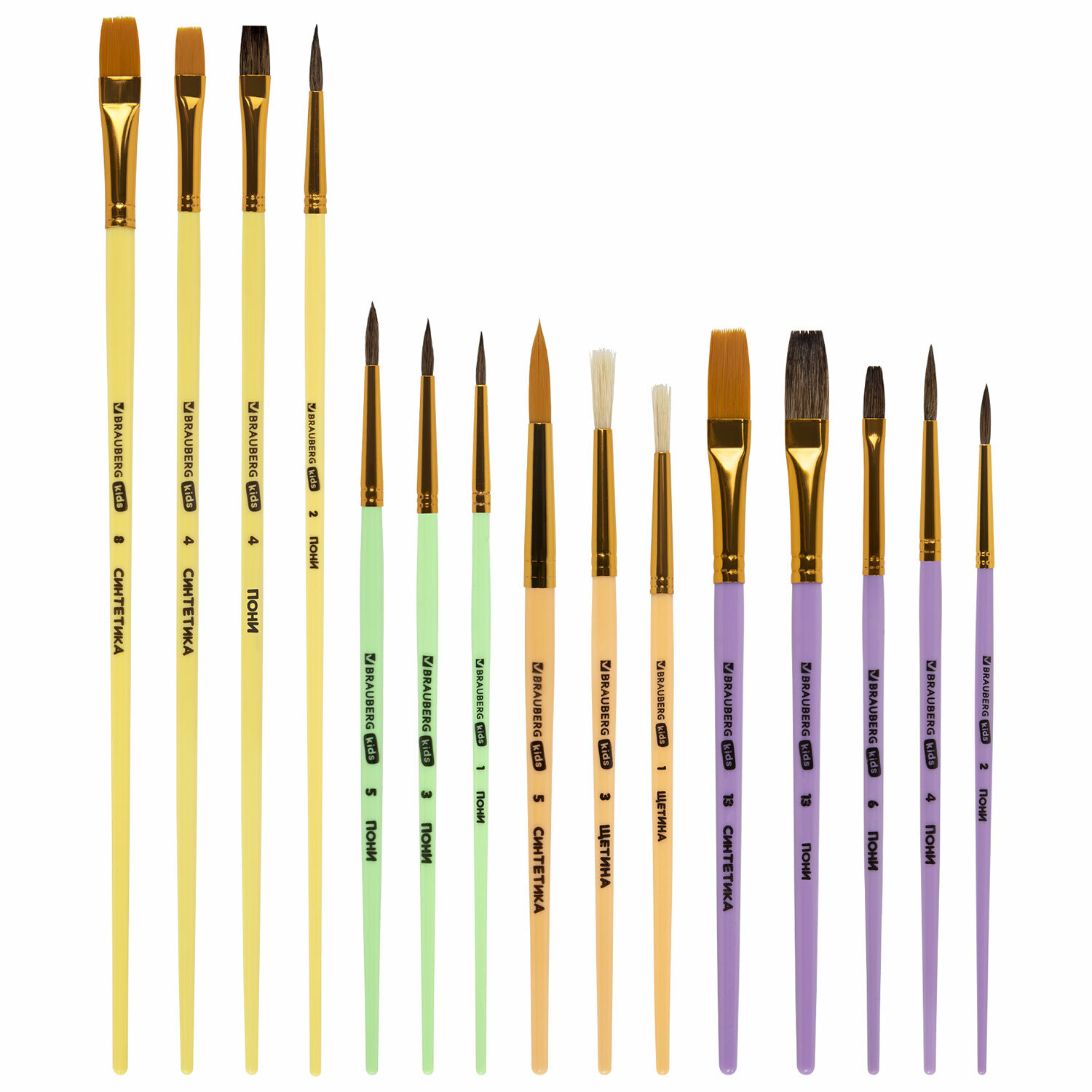 - Кисти НАБОР 15 шт. (ПОНИ – 9 шт., СИНТЕТИКА – 4 шт., ЩЕТИНА – 2 шт.) BRAUBERG KIDS, 201081