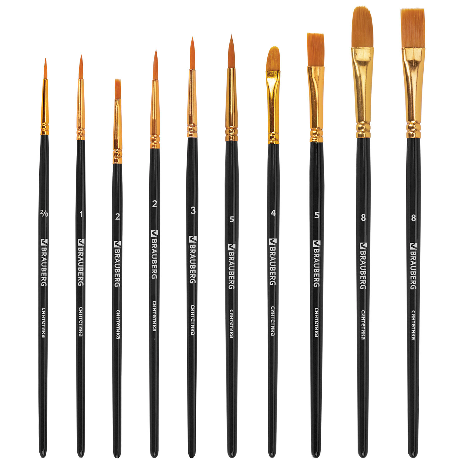 - Кисти синтетика BRAUBERG, НАБОР 10 шт., черные (Круглые; Овальные; Плоские; Лайнеры), 201028