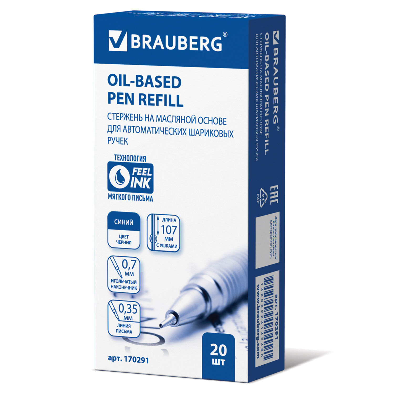- Стержень шариковый масляный BRAUBERG, 107 мм, СИНИЙ, с ушками, игольчатый узел 0,7 мм, линия письма 0,35 мм, 170291