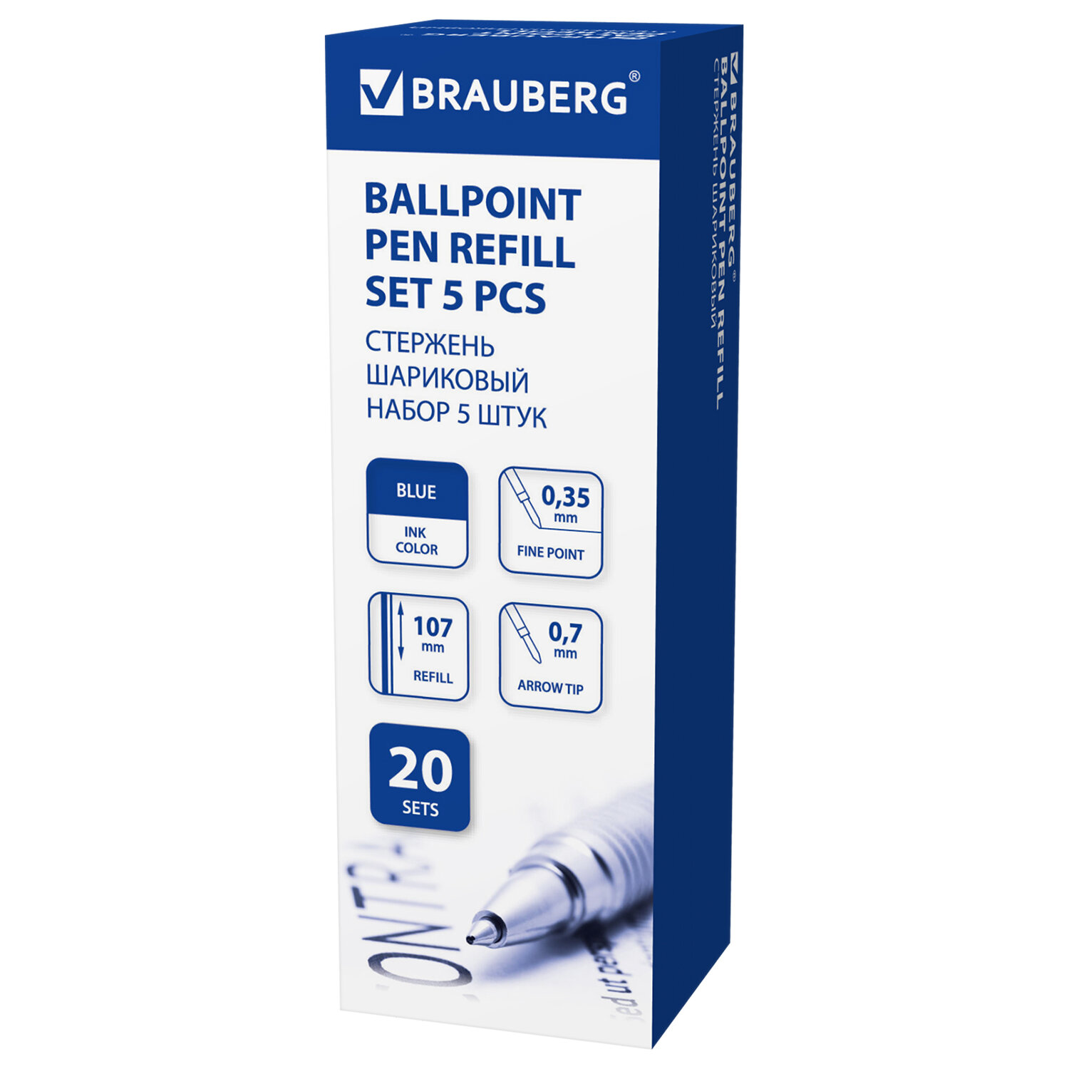 - Стержни шариковые BRAUBERG, НАБОР 5 шт., 107 мм, СИНИЕ, узел 0,7 мм, линия письма 0,35 мм, 170192