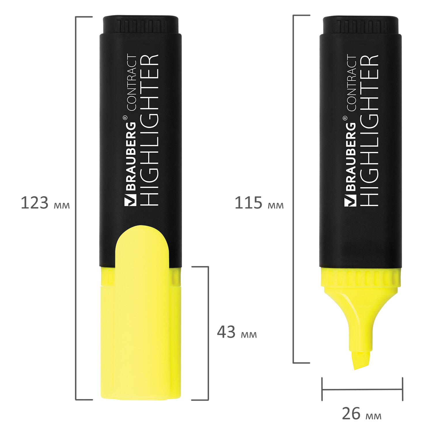 Текстовыделитель желтого цвета обладает неоновым спецэффектом. Скошенный наконечник имеет толщину линии письма от 1 до 5 мм. Текстовыделитель обладает продленной линией письма и экономным расходом чернил. Светоустойчивые чернила не выцветают даже на открытом солнце и не заметны при передаче текста по факсу. Колпачок с клипом и соответствует цвету чернил. Пластиковый корпус имеет диаметр 26 мм. Текстовыделитель BRAUBERG "Contract", ЖЕЛТЫЙ, линия 1-5 мм, 150389