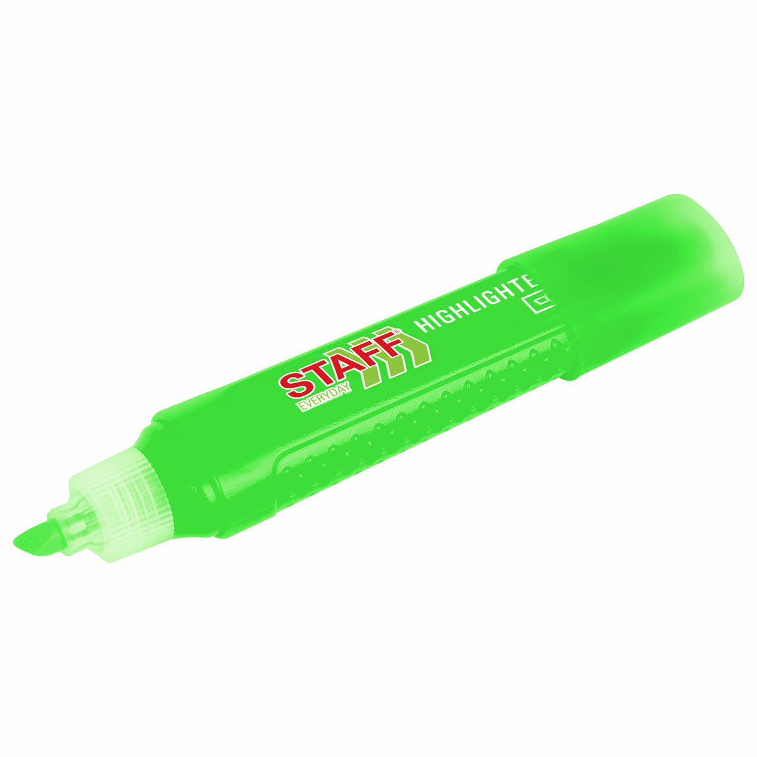 Текстовыделитель зеленого цвета обладает прямоугольной формой корпуса диаметром 24 мм. Корпус оснащен удобной зоной захвата. Скошенный наконечник имеет толщину линии письма от 1 до 5 мм, что обеспечивает удобство при работе с текстом, напечатанным мелким шрифтом, или таблицами.