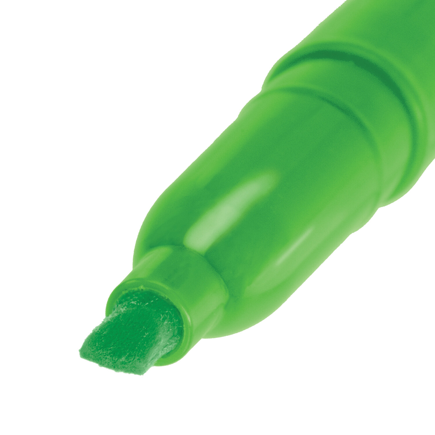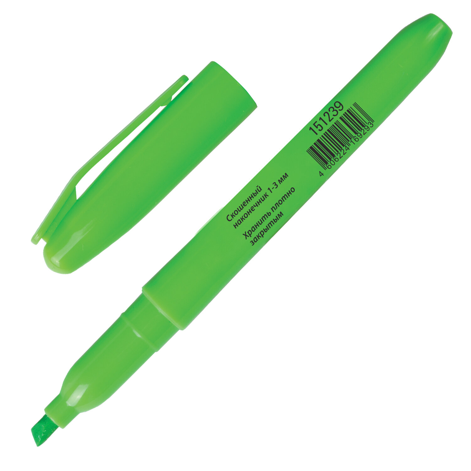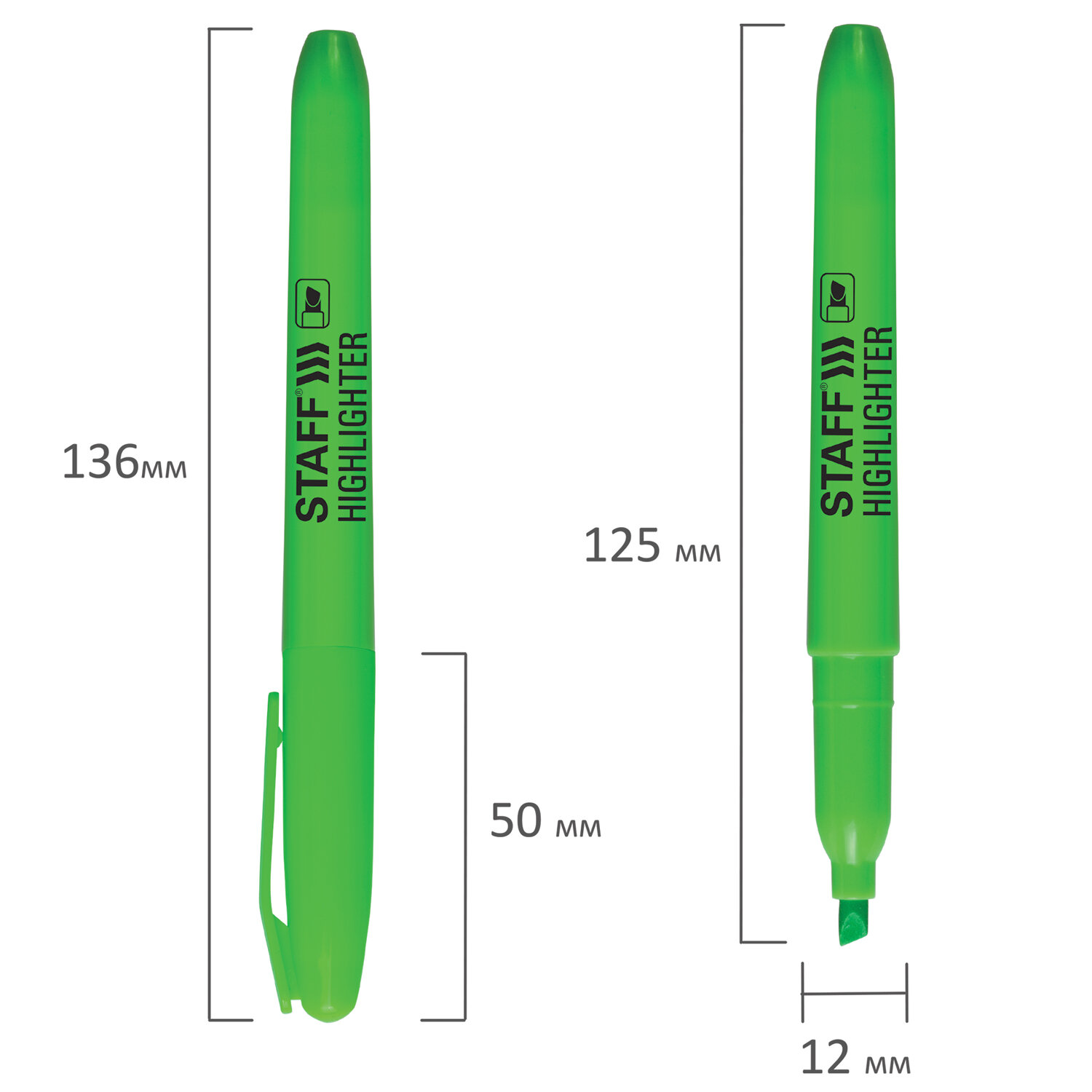 Текстовыделитель зеленого цвета обладает круглой формой корпуса диаметром 12 мм. Корпус тектовыделителя оснащен удобной зоной захвата. Скошенный наконечник имеет толщину линии письма от 1 до 3 мм, что обеспечивает удобство при работе с текстом, напечатанным мелким шрифтом, или таблицами. Текстовыделитель обладает экономным расходом чернил. Светоустойчивые чернила на водной основе не выцветают даже на открытом солнце и не размазываются в процессе использования. Изделие не перезаправляется. Корпус с колпачком соответствует цвету чернил.