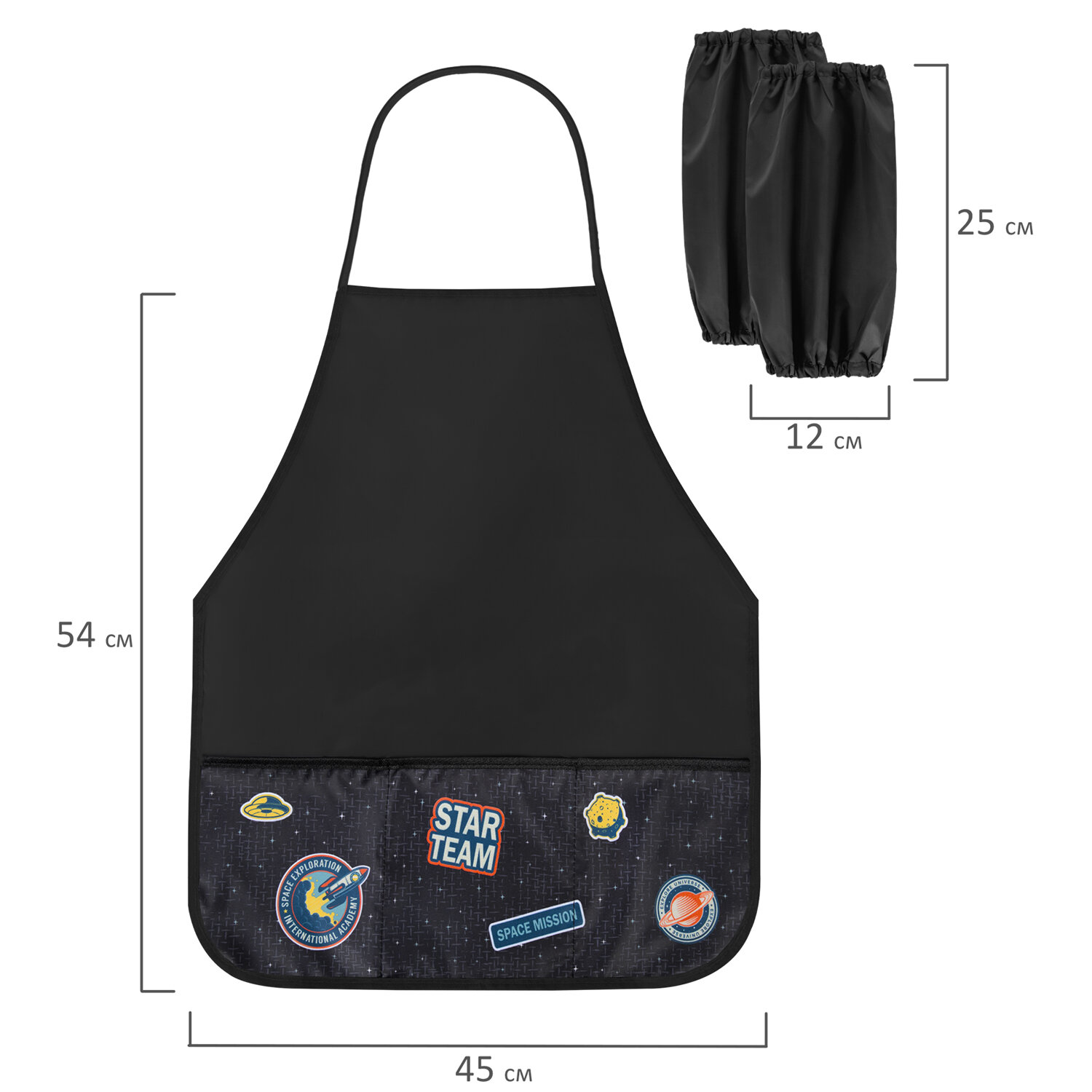 Ассортимент школьного текстиля BRAUBERG - это высокое качество и проработанные до мелочей модели с современным дизайном и широким функционалом. На протяжении 15 лет наши специалисты сосредоточены на разработке, производстве и совершенствовании текстильных товаров для детей и взрослых. Именно поэтому BRAUBERG выбирают дети и родители по всей стране. Накидка фартук с нарукавниками для труда BRAUBERG, 3 кармана, 46x54 см, "Space Mission", 271636