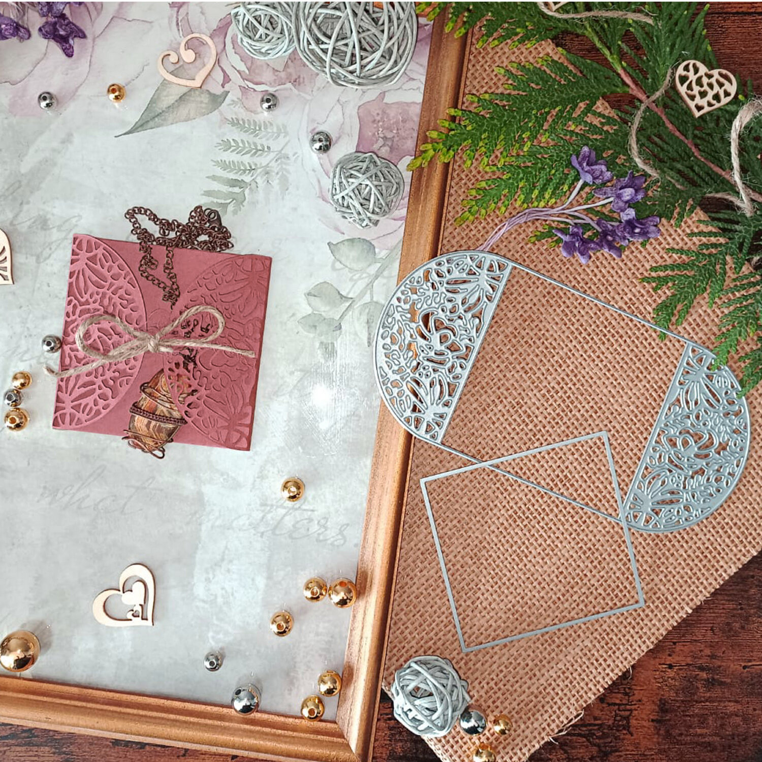В набор входит 2 фигурных стальных ножа: фигурная рамка размером 166х82 мм, и внутренняя квадратная рамка размером 75х75 мм. Нож многофункционален: он позволяет не только создать вырубку-заготовку складного приглашения или открытки с фигурными закрывающимися краями, но и нанести на поверхность изделия изящный эффект тиснения. Материалы, подходящие для работы - бумага, картон, алюминиевая фольга для рукоделия, фоамиран и другие.
