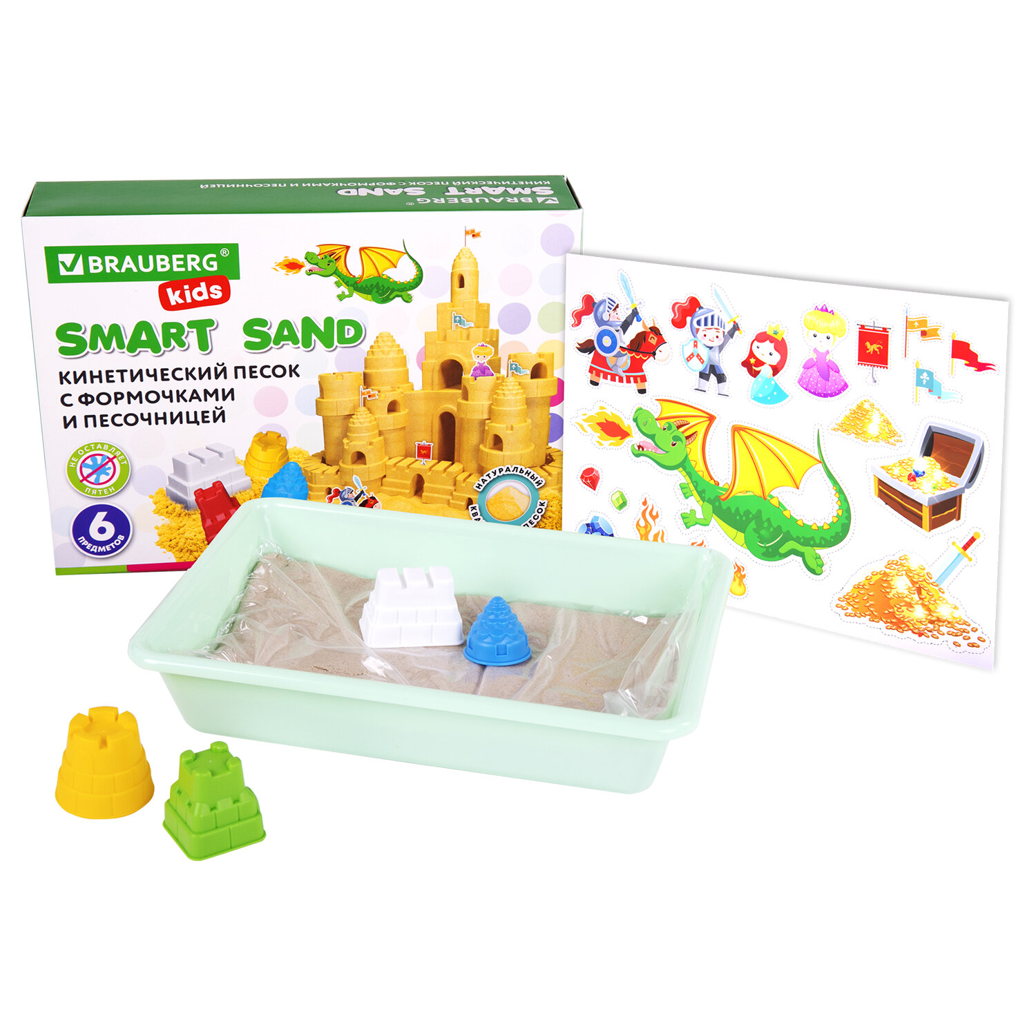 Состав набора: кинетический умный песок - 1 кг, пластиковая песочница для веселой игры 20х30х6 см - 1 шт., формочки для создания средневекового замка - 4 шт., лист-аппликация с персонажами для сюжетно-ролевой игры – 1 шт.