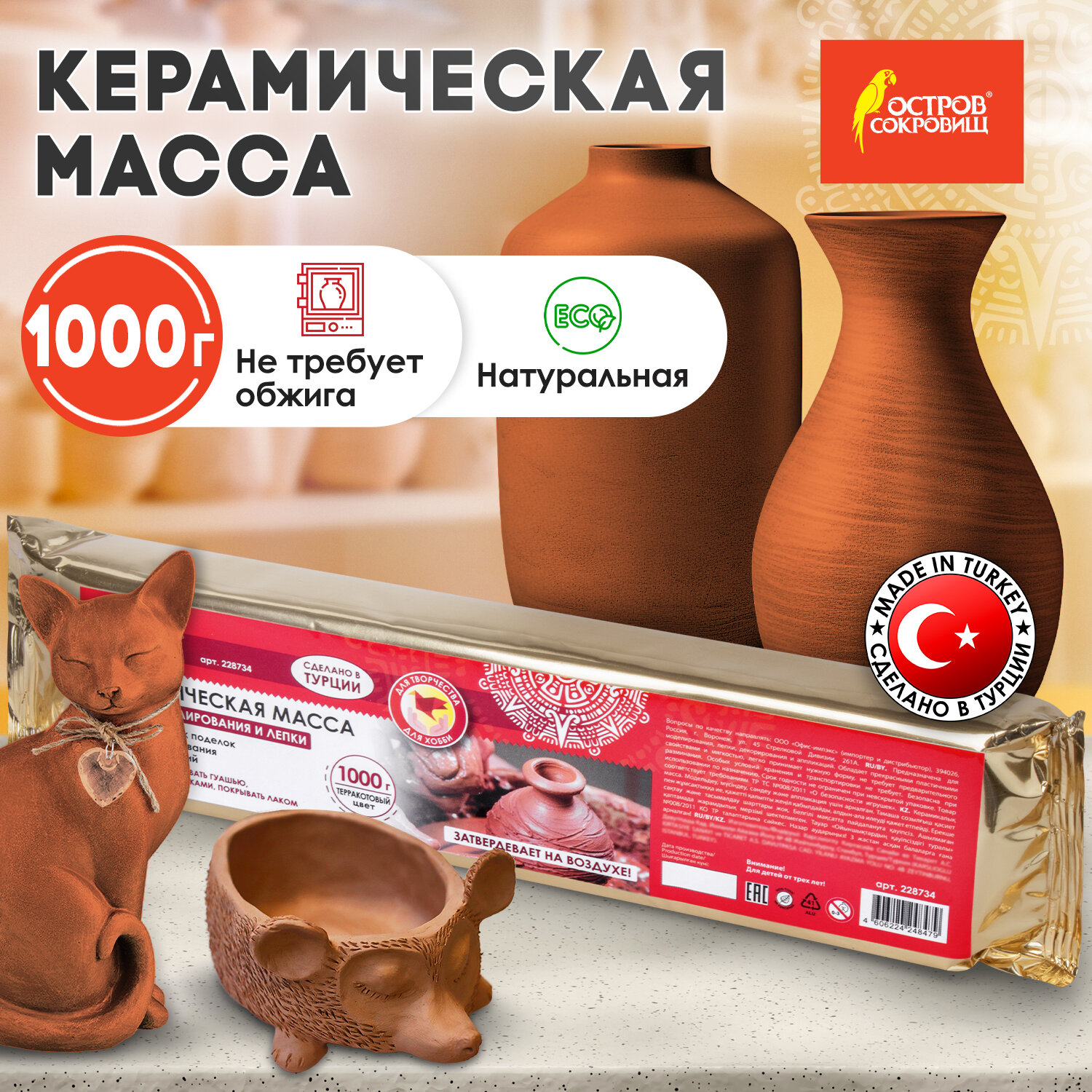 Условия хранения: храните массу в герметичной упаковке, вдали от источников тепла и прямых солнечных лучей. Масса керамическая для лепки ОСТРОВ СОКРОВИЩ, 1000 г, терракотовая, 228734