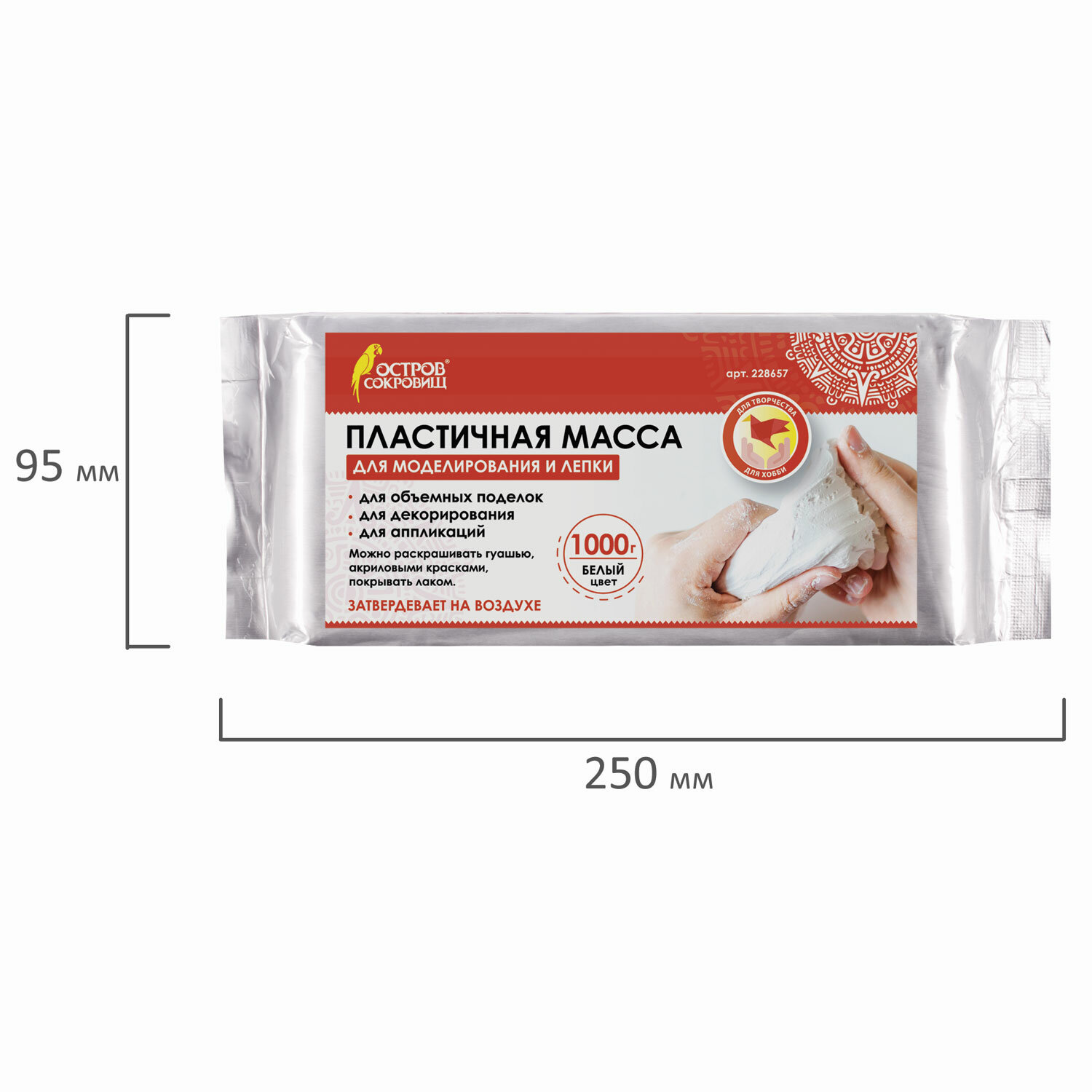 Масса для лепки ОСТРОВ СОКРОВИЩ белого цвета фасовкой 1000 г упакована в герметичную фольгированную упаковку, что позволяет хранить товар в течение длительного времени. Масса очень податлива: моделируется руками, пластична, легко лепится, раскатывается, режется, принимает любую форму. При необходимости можно использовать инструменты. Чтобы избежать появление трещин на изделии после застывания, необходимо работать с массой влажными руками. Затвердевает на воздухе, после высыхания становится очень прочной, не усаживается.