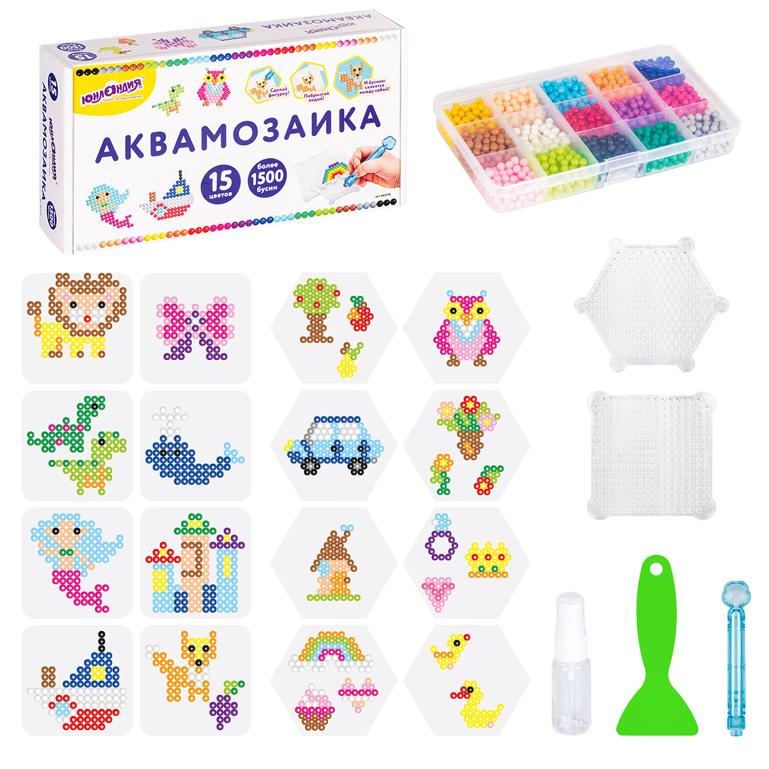 В набор входят бусины 15 различных цветов, около 100 штук каждого цвета, пластиковый контейнер с отсеками для удобного хранения бусин, 2 подставки-трафарета, 8 двусторонних карточек с картинками, бутылочка-пульверизатор для воды, специальная ручка для аквамозаики и лопатка для снятия готовой фигурки с трафарета.
