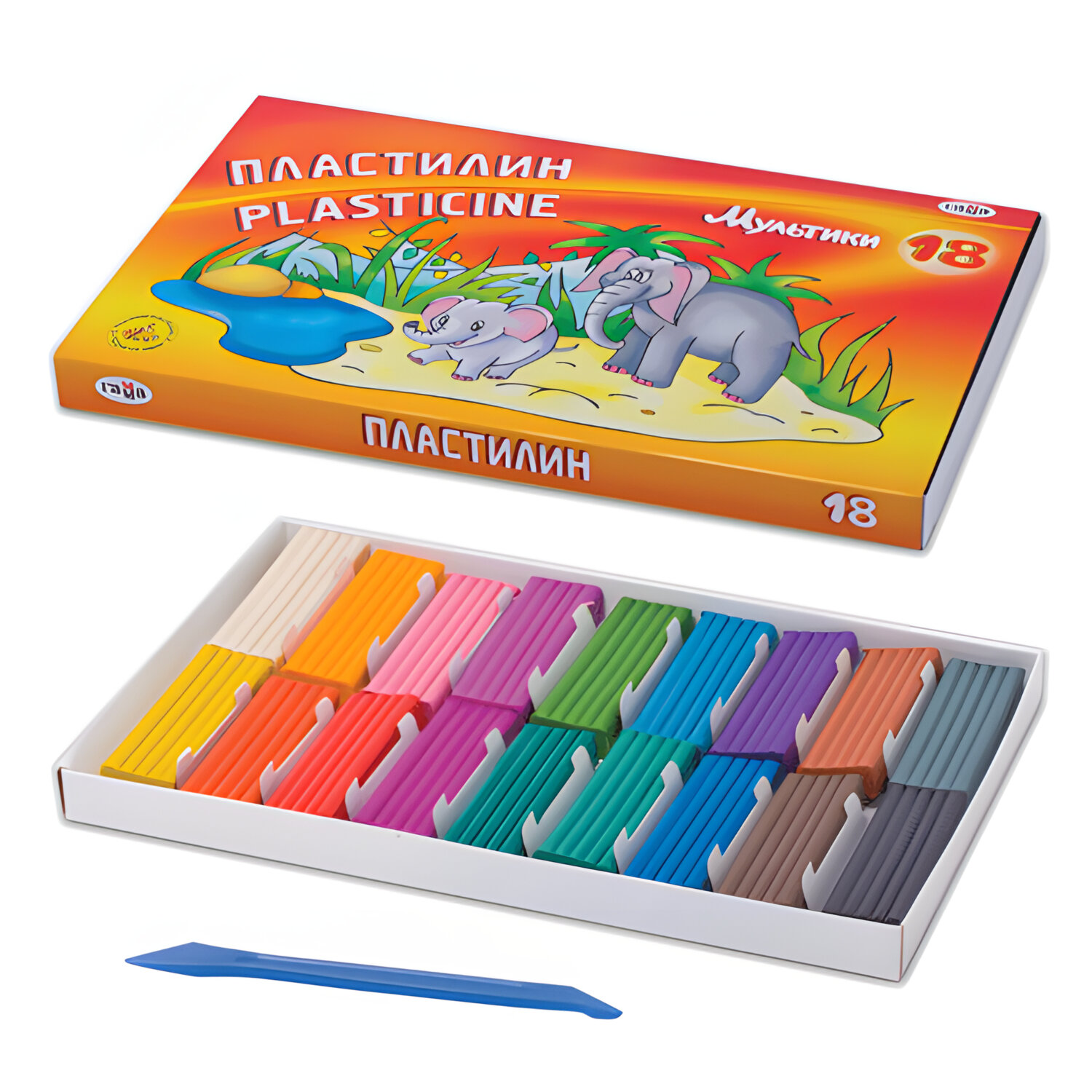 В состав набора входит 18 разноцветных брусков пластилина в картонной упаковке. Пластилин ГАММА "Мультики", 18 цветов, 360 г, со стеком, 280028