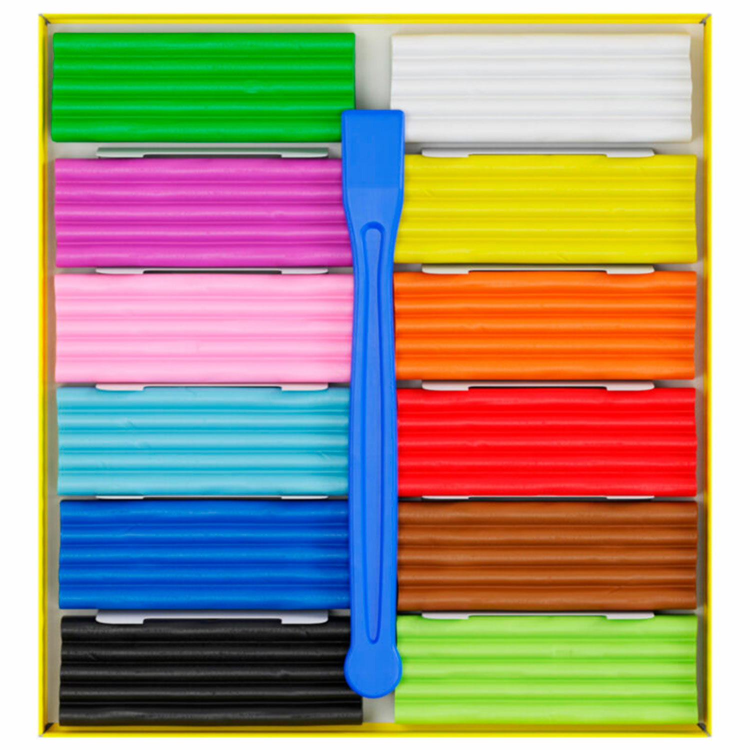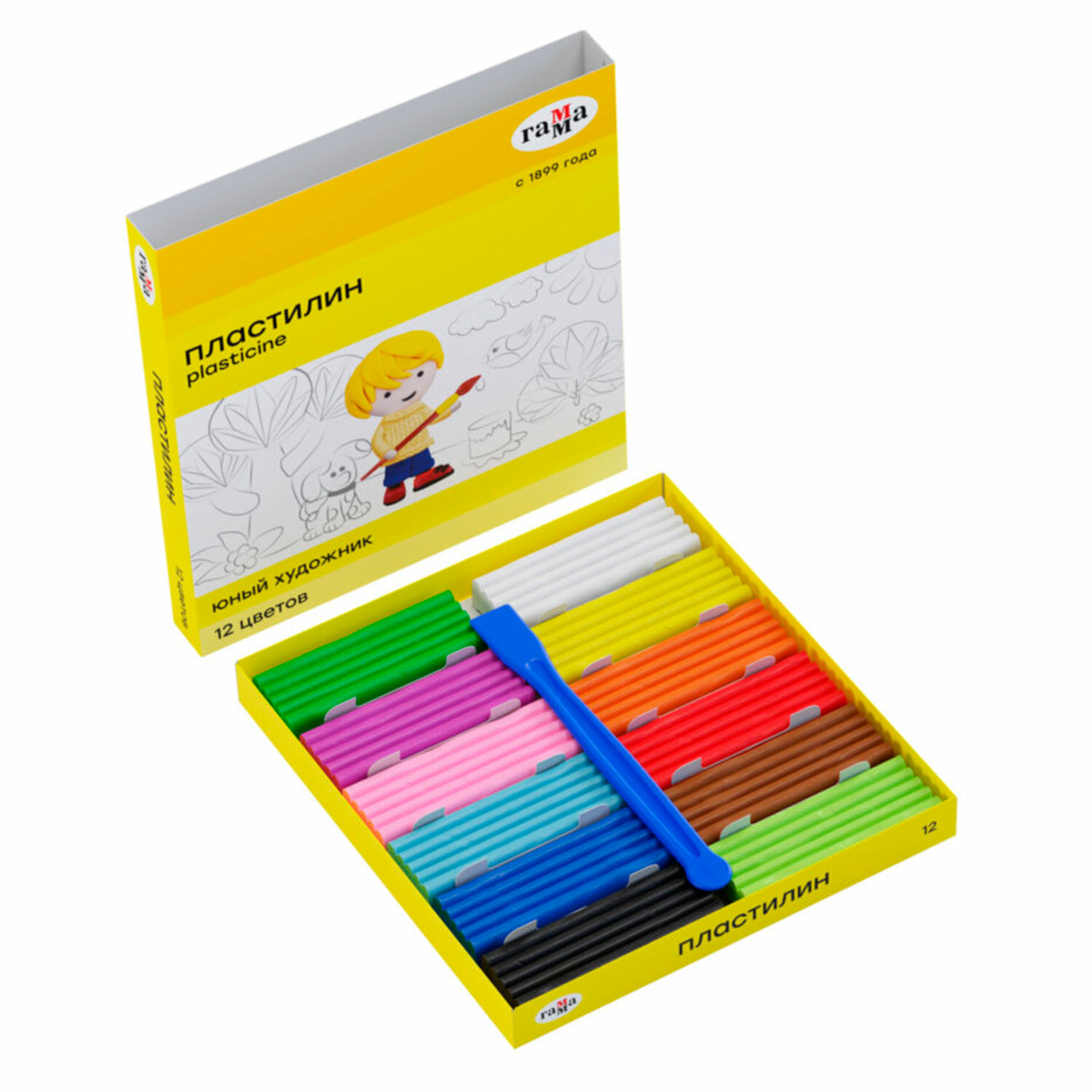 Цвета: белый, сиреневый, розовый, красный, голубой, синий, желтый, оранжевый, светло-зеленый, зеленый, коричневый, черный. Пластилин ГАММА "Юный художник NEW", 12 цветов, 168 г, со стеком, 280045