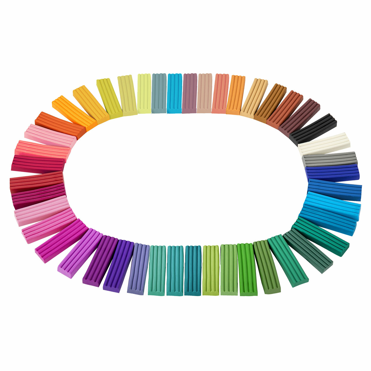 В составе набора 45 брусков по 14 г разных цветов: белый, телесный, банан, охра, ярко-оранжевый, манго, оранжевый, коралловый, красный, вишневый, малиновый, светло-розовый, розовый, лиловый, светло-сиреневый, темно-лиловый, сиреневый, слива, фиолетовый, ультрамарин, светло-синий, синий, светлый лимон, тёмный желтый, желтый, зеленый арбуз, лимон, оливковый, салатовый, мятная жвачка, светло-зеленый, зеленый, изумрудный, темно-зеленый, бирюзовый, голубой, ежевика, светло-серый, серый, терракотовый, красно-коричневый, светло-коричневый, капучино, темно-коричневый, черный.