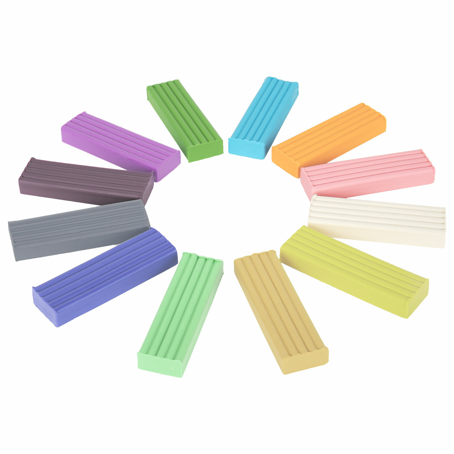 В составе набора 12 брусков по 15 г разных цветов: белый, светло-розовый, светло-сиреневый, голубой, охра, оливковый, светло-серый, зеленый арбуз, слива, ярко-оранжевый, банан, капучино.