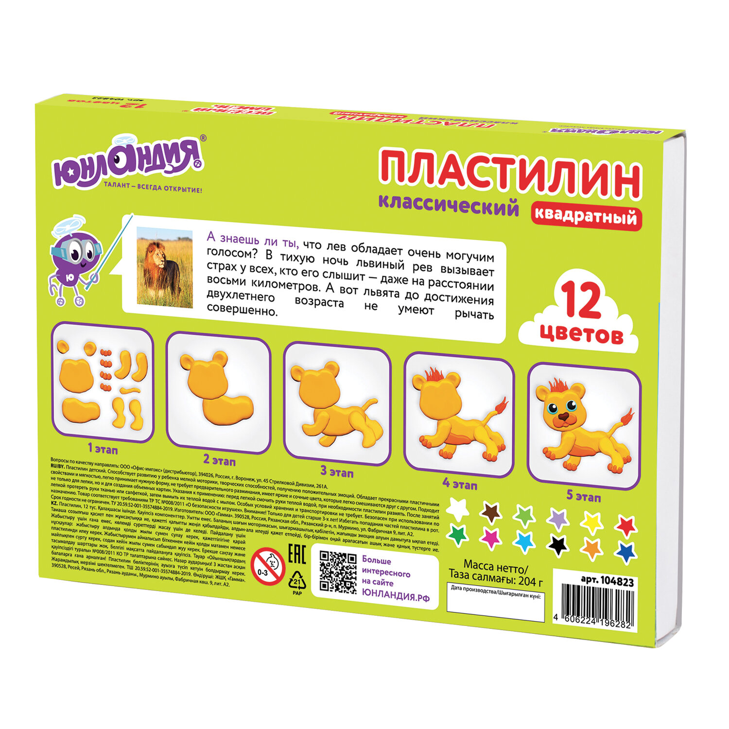 - Пластилин классический ЮНЛАНДИЯ "ВЕСЁЛЫЙ ШМЕЛЬ", 12 цветов, 204 г, СО СТЕКОМ, КВАДРАТНЫЙ, 104823