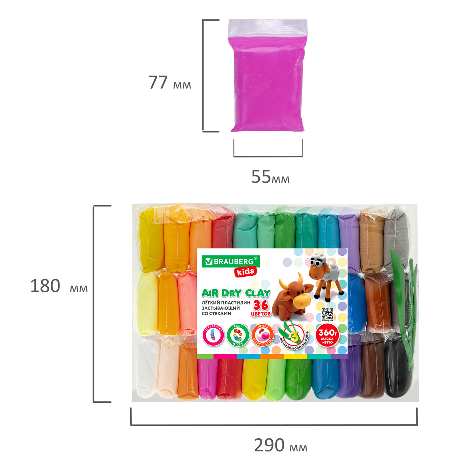 - Пластилин супер лёгкий воздушный застывающий 36 цветов, 360 г, 3 стека, BRAUBERG KIDS, 106308