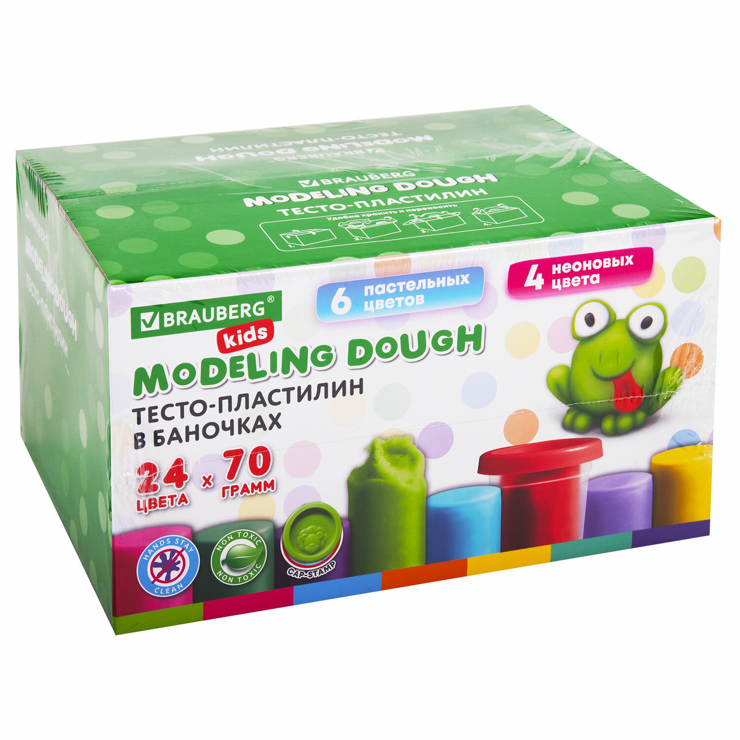 - Пластилин-тесто для лепки BRAUBERG KIDS, 24 цвета, 1680 г, крышки-штампики, сундучок, 106722