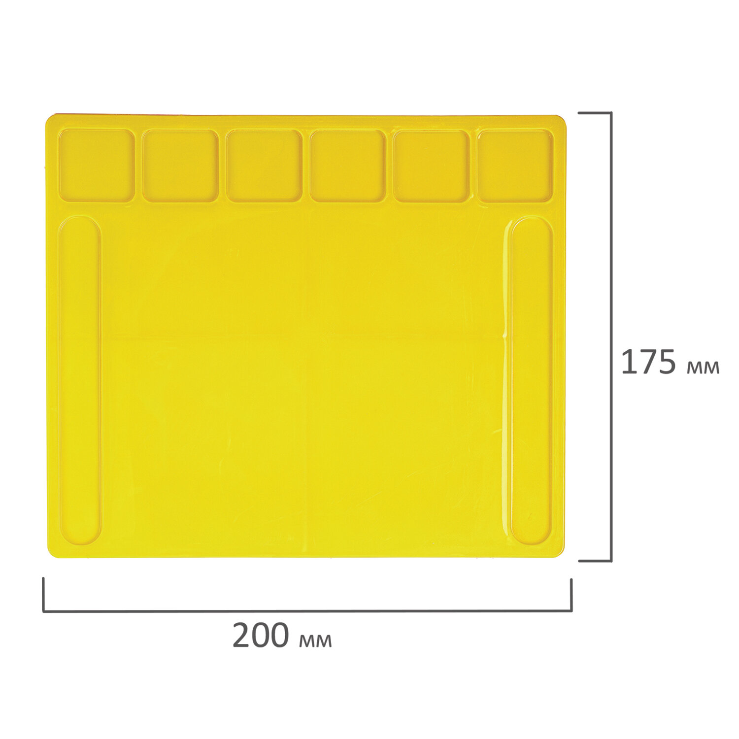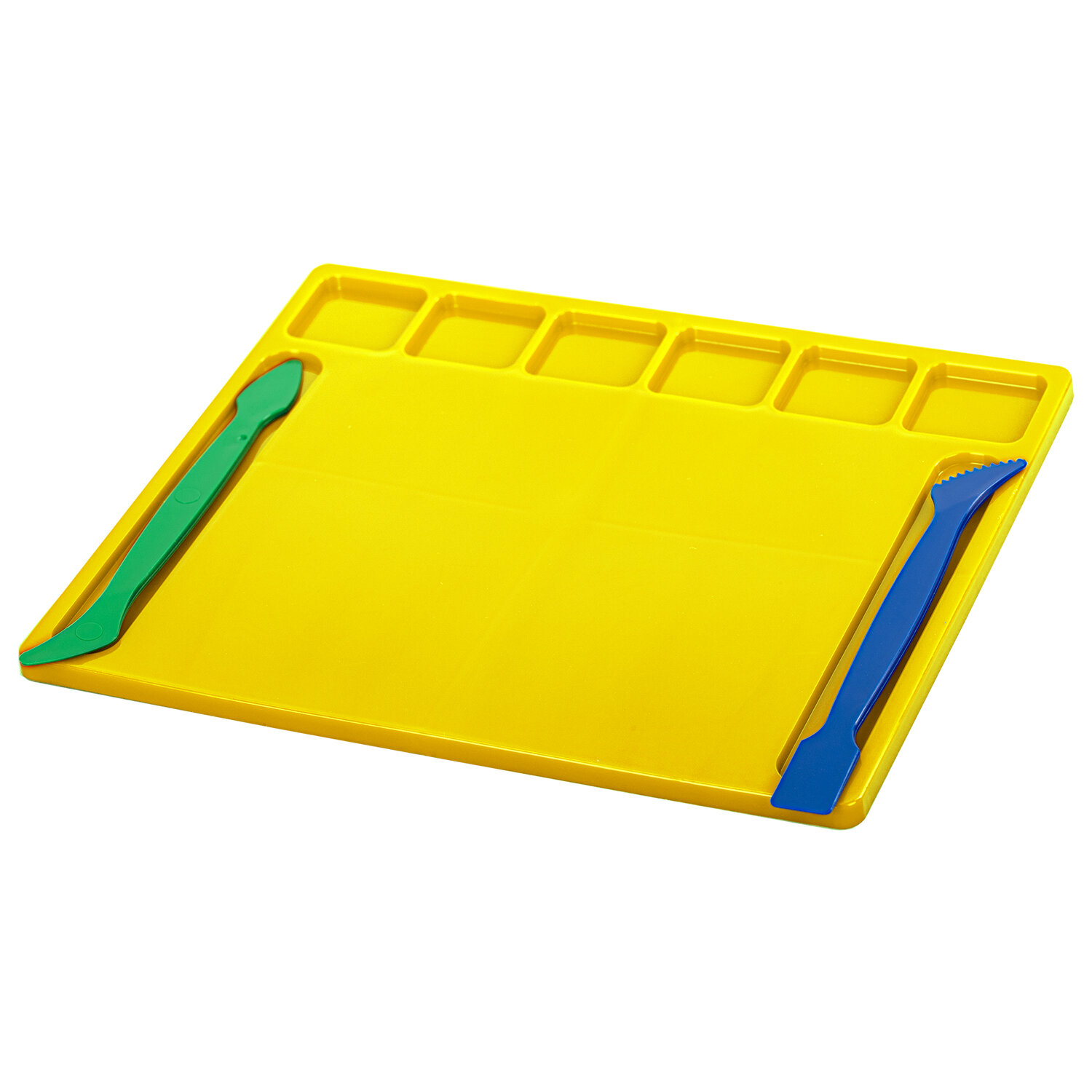 Набор состоит из 3-х предметов: 2-х стеков и доски. Доска для лепки имеет удобную, функциональную форму с углублениями для стеков и 6 отделениями для пластилина. Производится из жесткого прочного пластика толщиной 1,65 мм, к которому не липнет пластилин. Размер - 200х170 мм. Выполнена в ярко-желтом цвете. Поставляется в термоусадочной пленке.