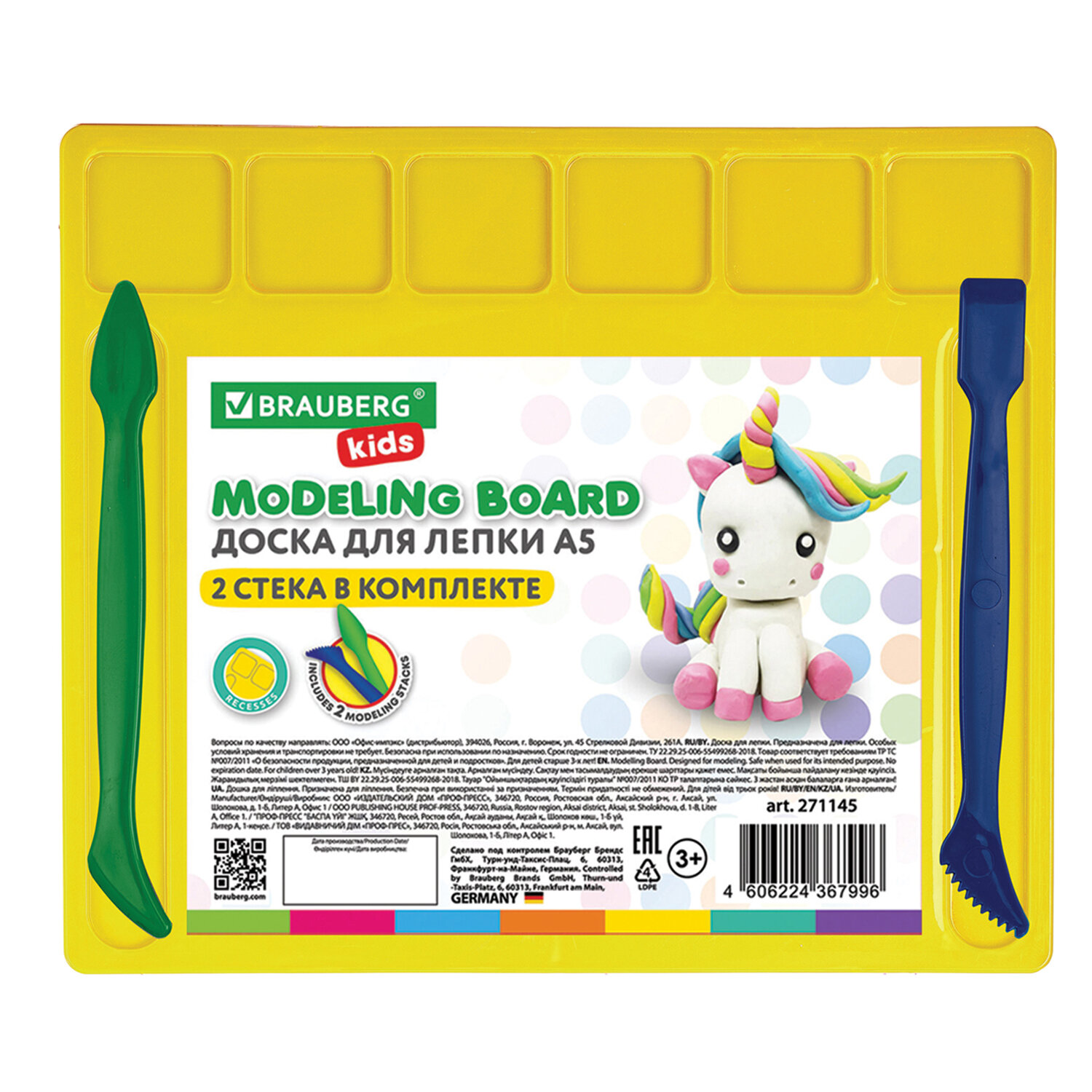 - Доска для лепки с отделениями и 2 стеками А5, 200х170 мм, ассорти, BRAUBERG KIDS, 271145