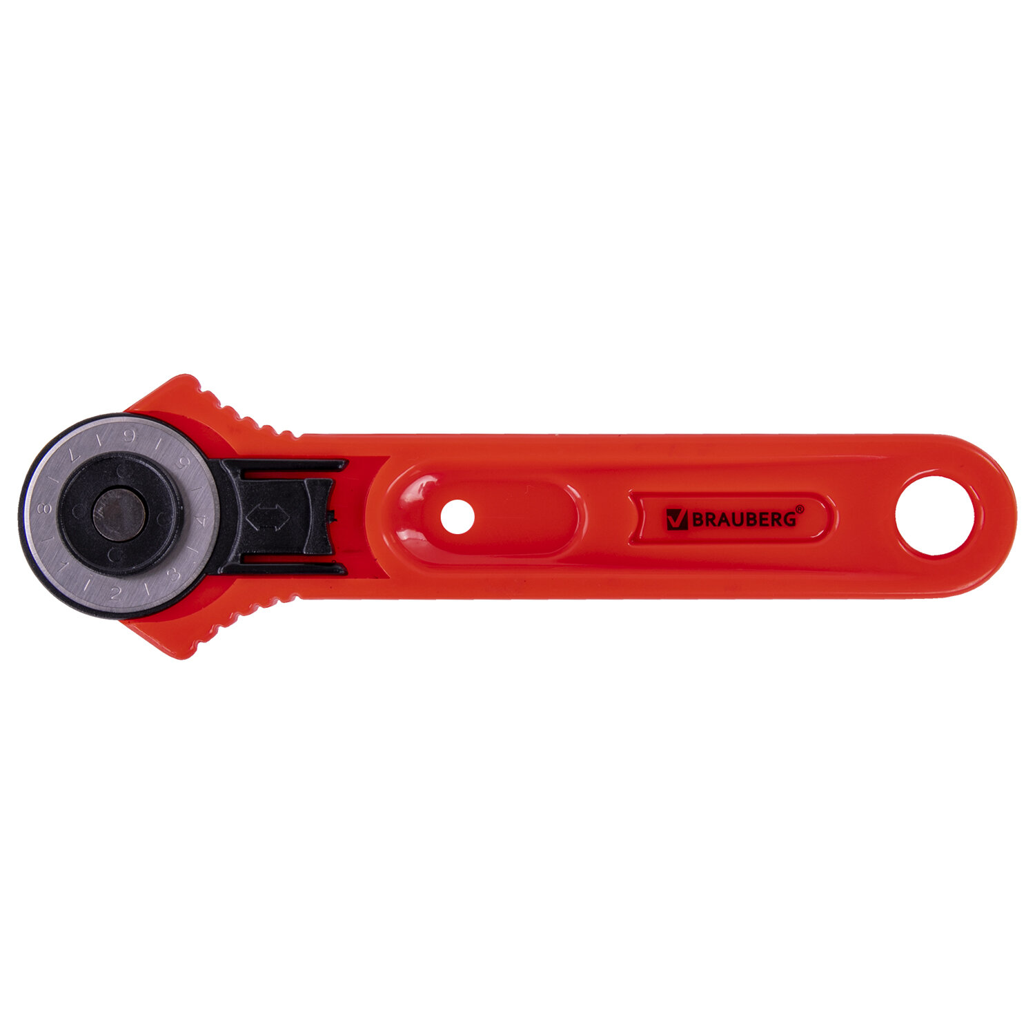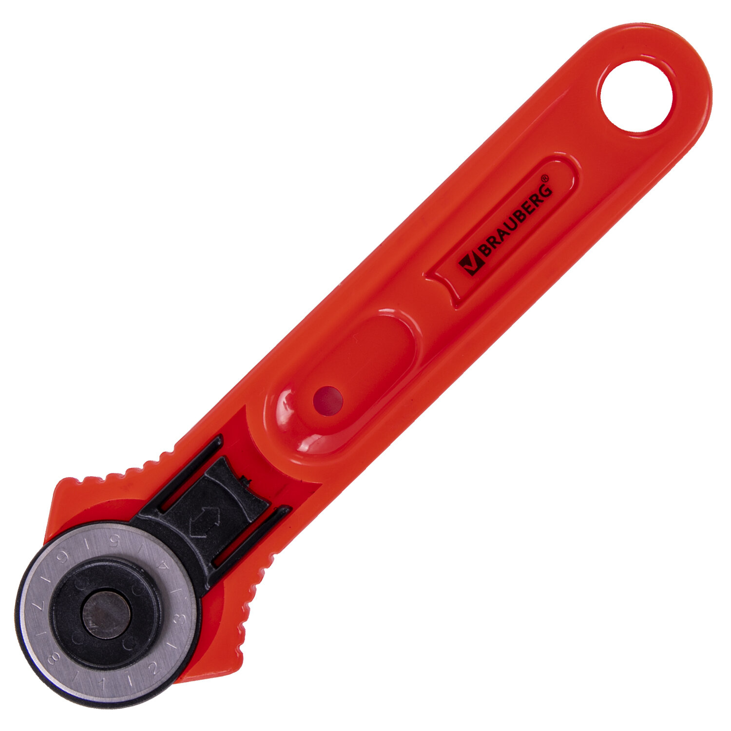 Снабжен отверстием для подвеса и автофиксатором. Имеется защитный футляр для лезвия. Нож раскройный роликовый 28 мм BRAUBERG, круглое лезвие, 238090