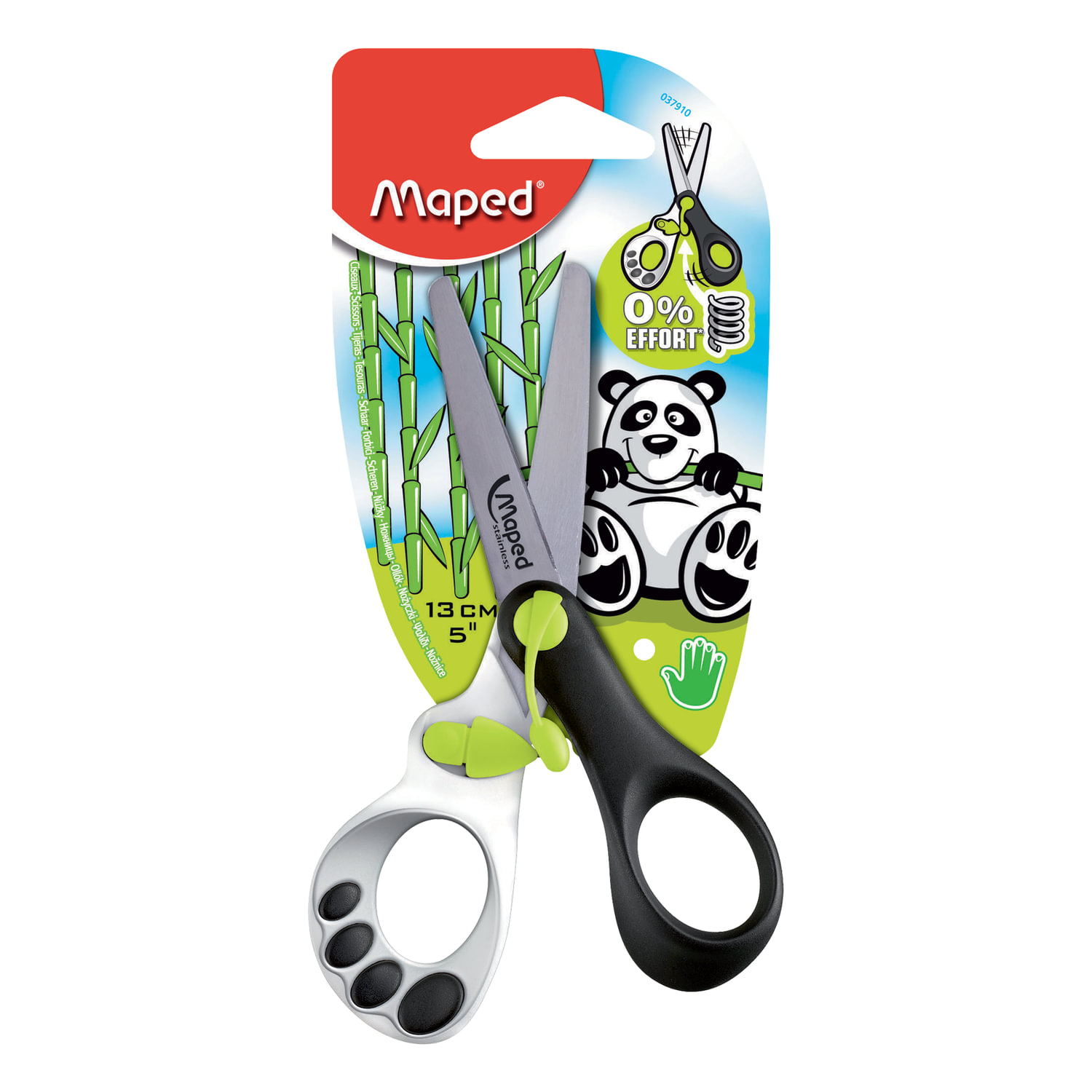 Эргономичные ручки одинаково удобны для правшей и левшей. Лезвия с закругленным концом для повышенной безопасности высокого качества - легко разрезают и не мнут бумагу. Забавный дизайн с окраской панды вовлечет малыша в процесс обучения. Материал ножниц - нержавеющая сталь, пластик. Поставляется в черно-белом цвете с зеленой стрелкой. Длина - 130 мм. Ножницы MAPED (Франция) "Koopy", 130 мм, закругленные, детские, картонная упаковка с европодвесом, 037910