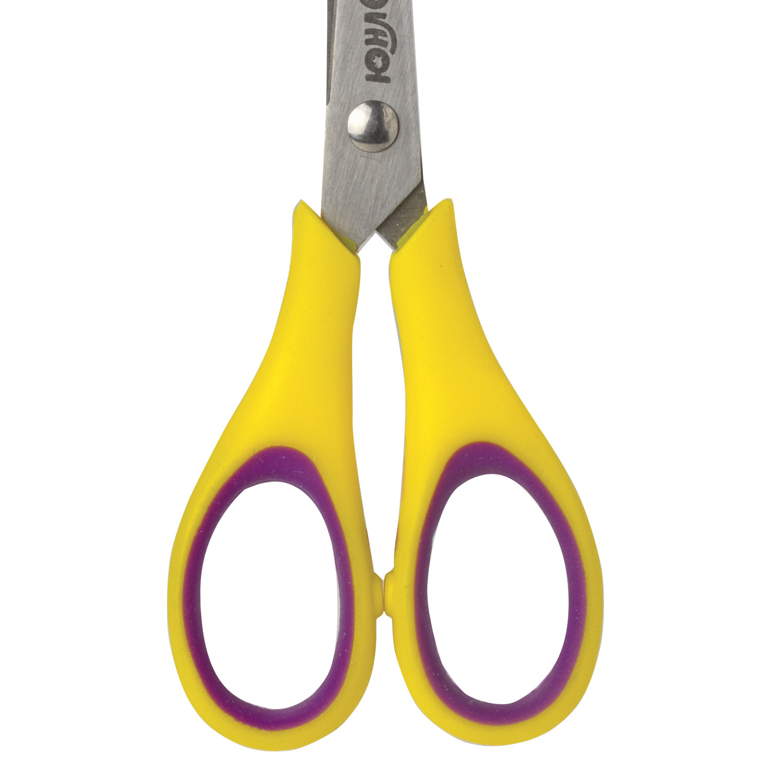 Ножницы ЮНЛАНДИЯ с симметричными ручками имеют удобные резиновые вставки желто-фиолетового цвета, которые не позволяют пальцам скользить во время использования.
