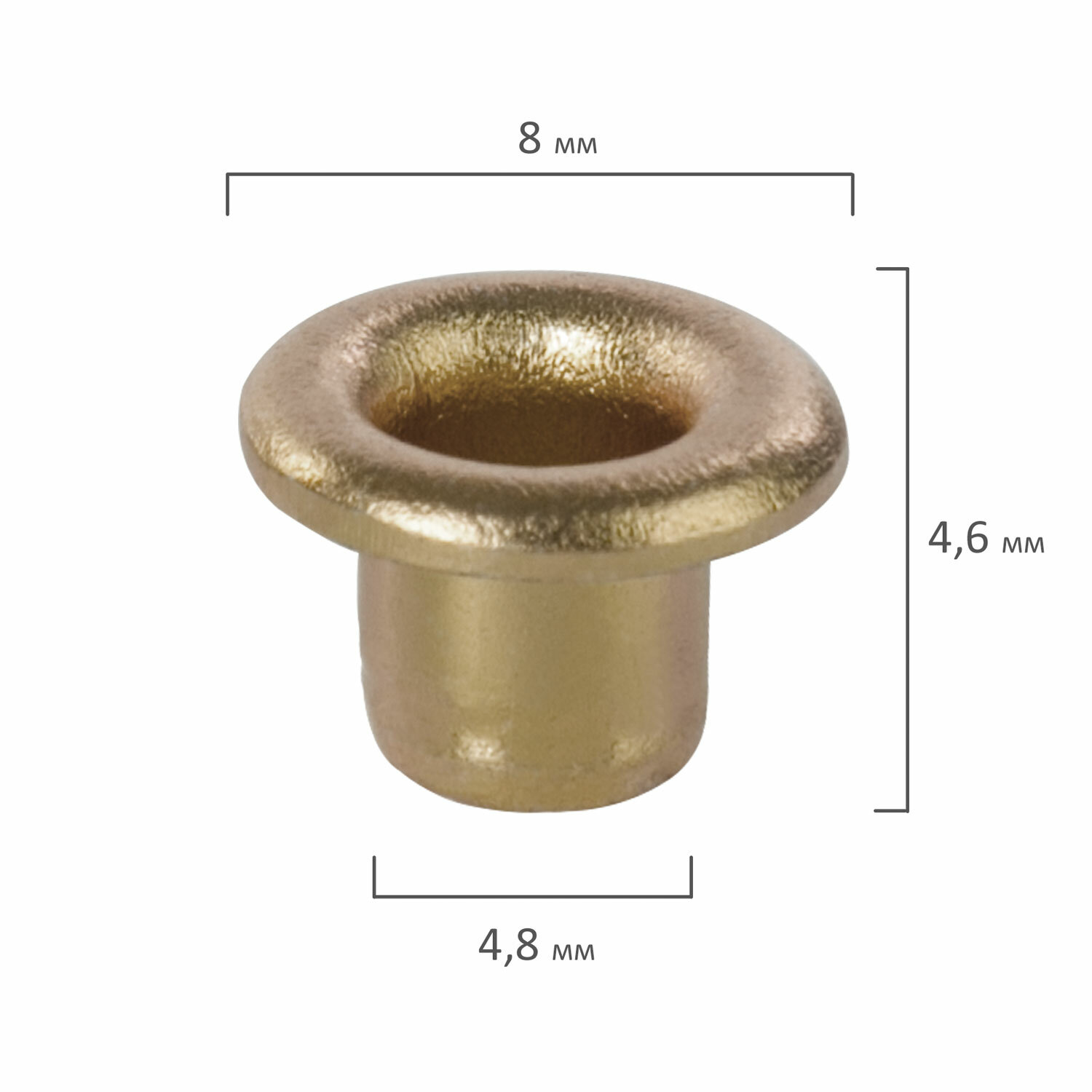 Изготовлены из металла золотистого цвета. Длина – 4,6 мм, внутренний диаметр – 4,8 мм. 250 штук в комплекте. Поставляются в пластиковом цилиндре. Люверсы золотистые КОМПЛЕКТ 250 шт., внутренний диаметр 4,8 мм, длина 4,6 мм, BRAUBERG, 272764