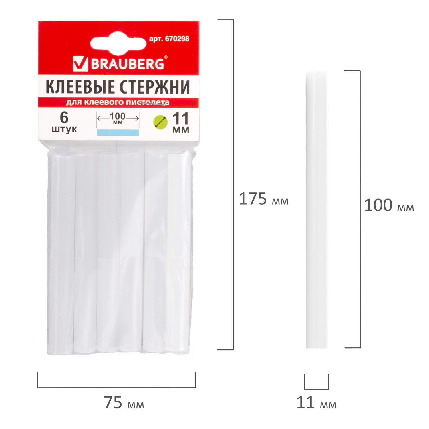 - Клеевые стержни, диаметр 11 мм, длина 100 мм, белые, комплект 6 штук, BRAUBERG, европодвес, 670298