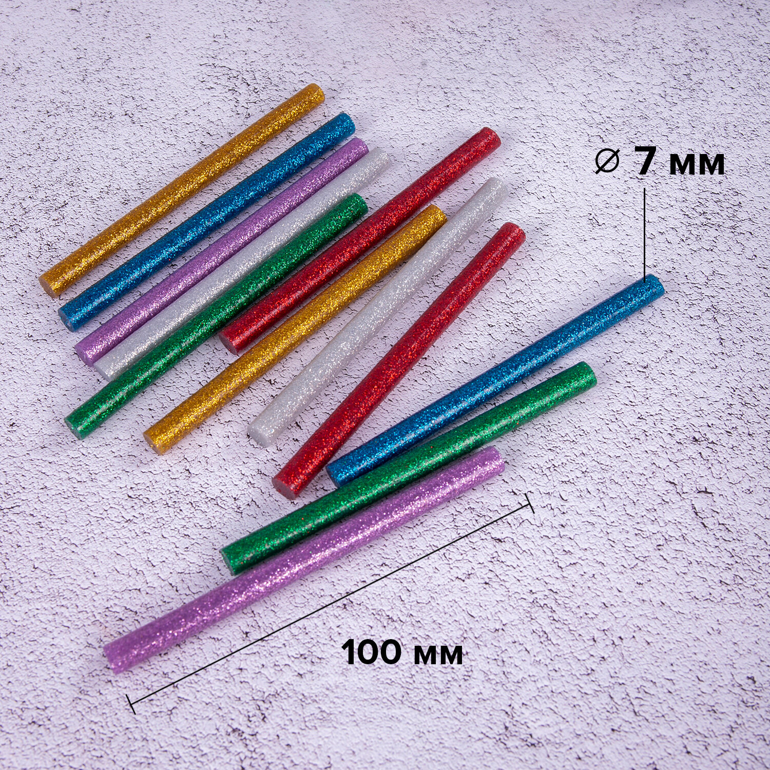 - Клеевые стержни, диаметр 7 мм, длина 100 мм, цветные (ассорти), С БЛЕСТКАМИ, КОМПЛЕКТ 12 шт., 6 цветов, BRAUBERG, 670319