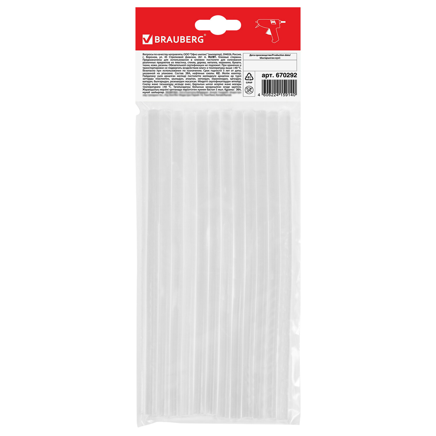 - Клеевые стержни, диаметр 7 мм, длина 200 мм, прозрачные, комплект 12 шт., BRAUBERG, европодвес, 670292