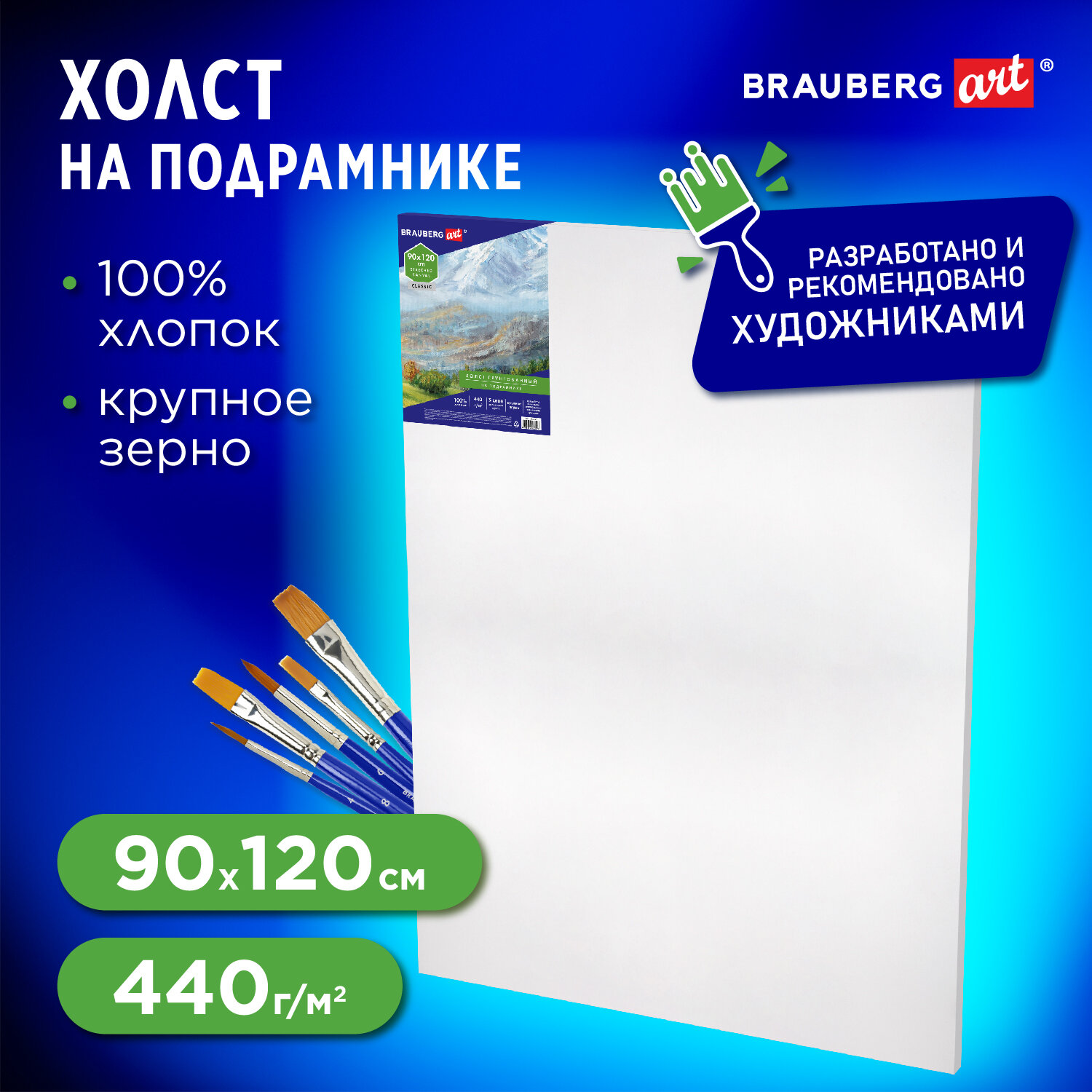- Холст на подрамнике BRAUBERG ART CLASSIC, 90х120см, 440 г/м2, грунт, 100% хлопок, крупное зерно 191027
