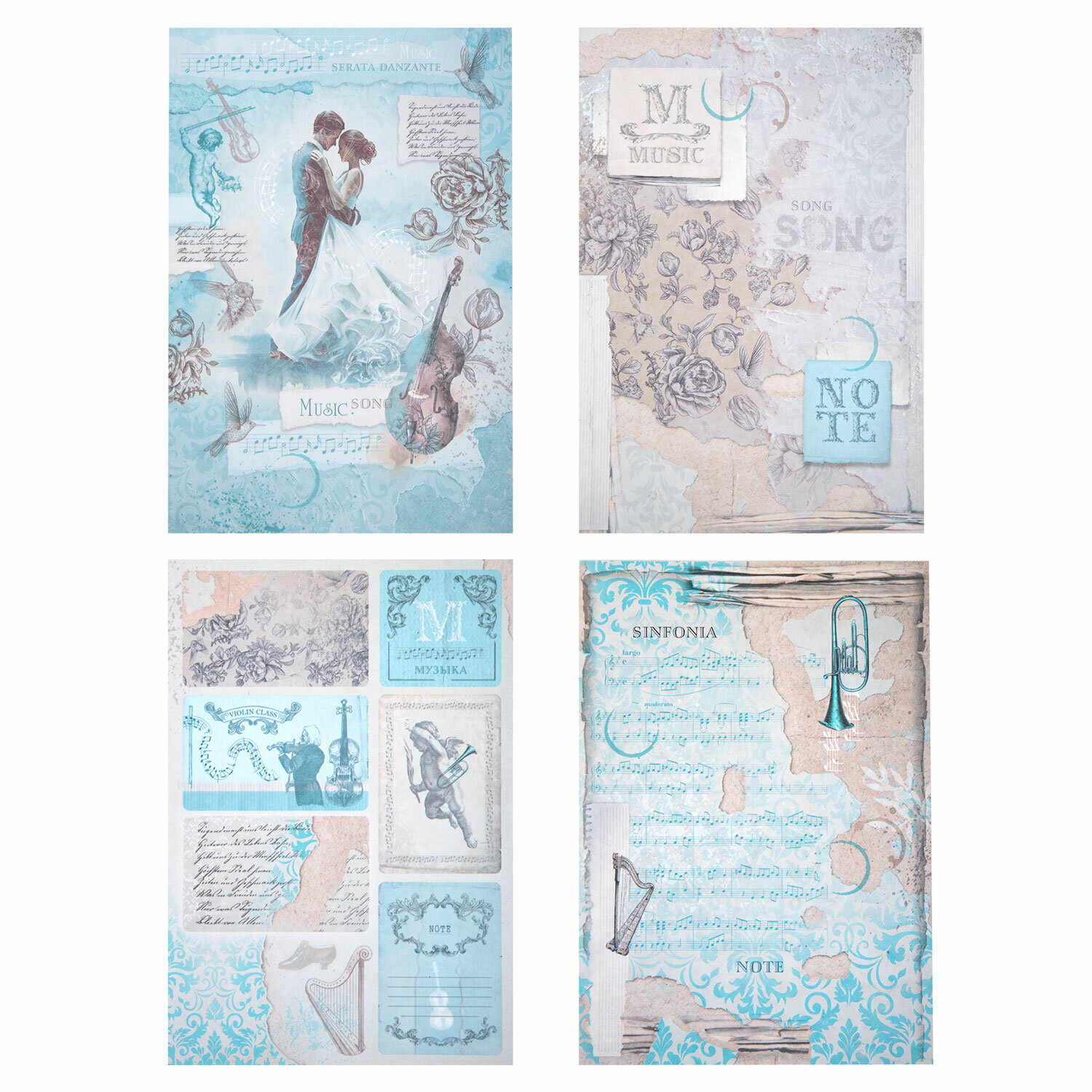 Стиль t;Нотная Гаммаt; содержит спокойные дизайны в бежево-голубых тонах и прекрасно подойдёт для создания фотоальбомов, блокнотов для записей и других изделий.