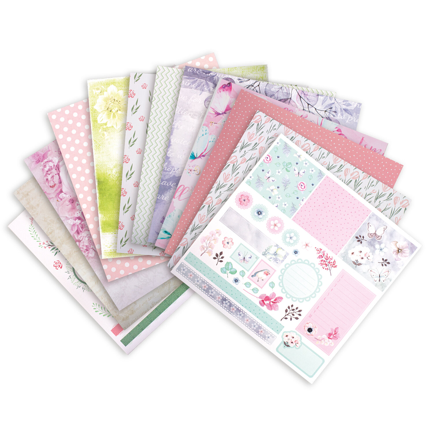 В набор входят 12 листов двусторонней бумаги плотностью 180 г/м2, содержащих 12 вариантов дизайна: 10 фоновых дизайнов и 2 набора с фигурными вырубками для вырезания. Стандартный размер бумаги 30х30 см делает её удобной для использования в создании скрап-альбомов. Матовая бумага отличается высоким качеством печати.