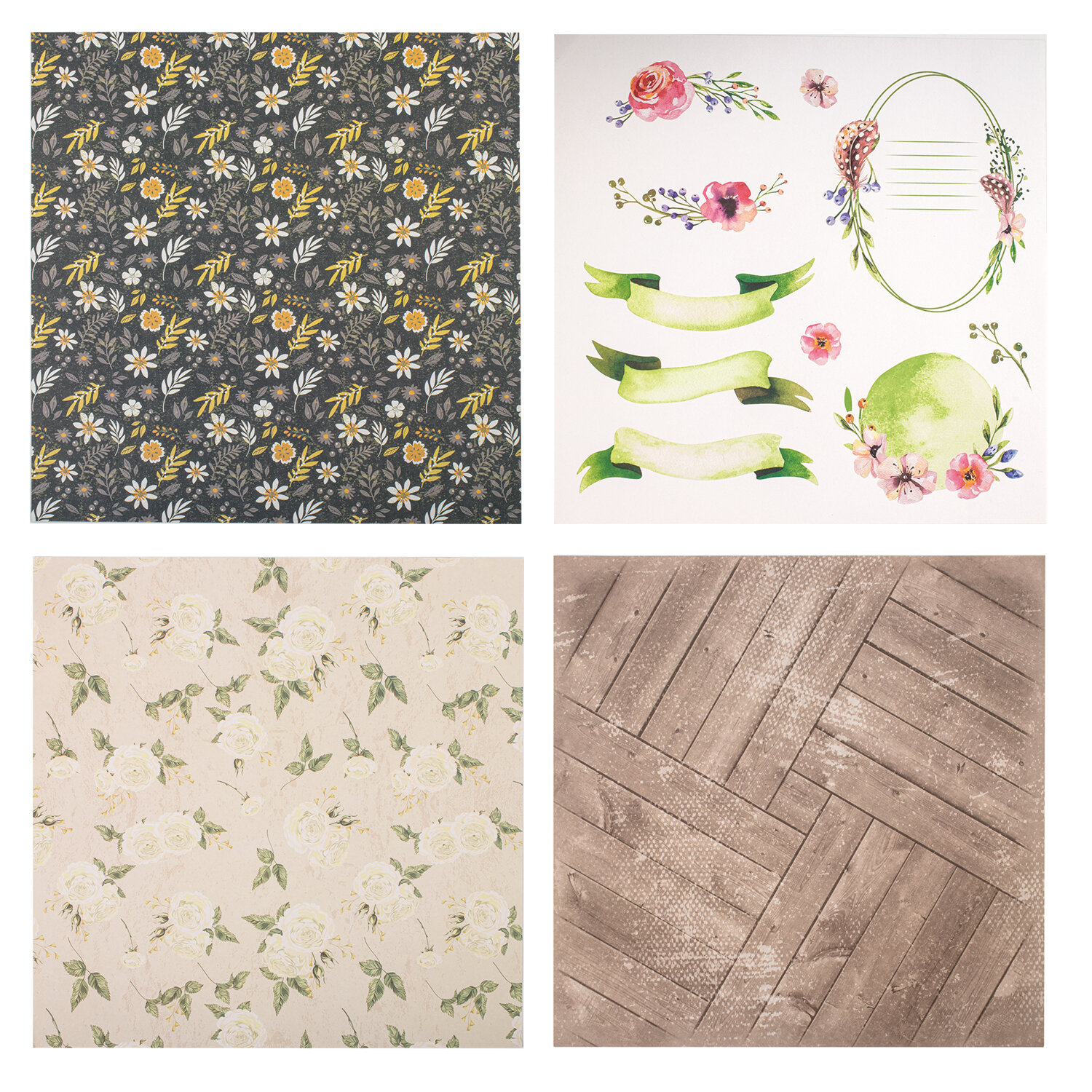 В набор входят 12 листов двусторонней бумаги плотностью 180 г/м2, содержащих 12 вариантов дизайнов: 10 фоновых дизайнов и 2 набора с фигурными вырубками для вырезания. Стандартный размер бумаги 30х30 см делает её удобной для использования в создании скрап-альбомов. Матовая бумага отличается высоким качеством печати.