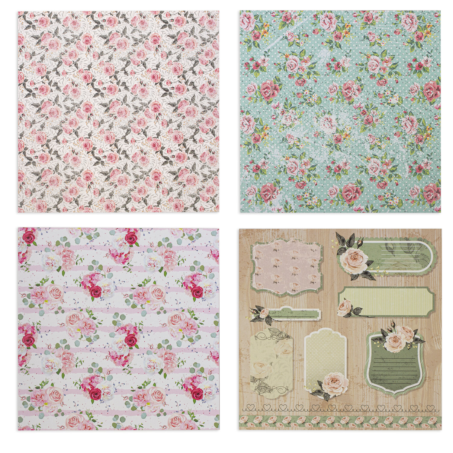 В набор входят 12 листов двусторонней бумаги плотностью 180 г/м2, содержащих 12 вариантов дизайна: 10 фоновых дизайнов и 2 набора с фигурными вырубками для вырезания. Стандартный размер бумаги 30х30 см делает её удобной для использования в создании скрап-альбомов. Матовая бумага отличается высоким качеством печати.
