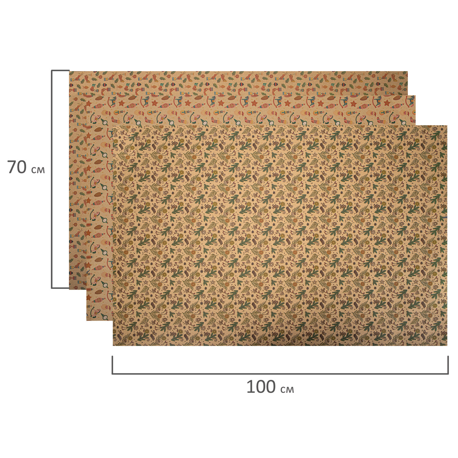 - Бумага упаковочная новогодняя НАБОР 3 шт., "Christmas Kraft", 70х100 см, 3 дизайна, ЗОЛОТАЯ СКАЗКА, 592056