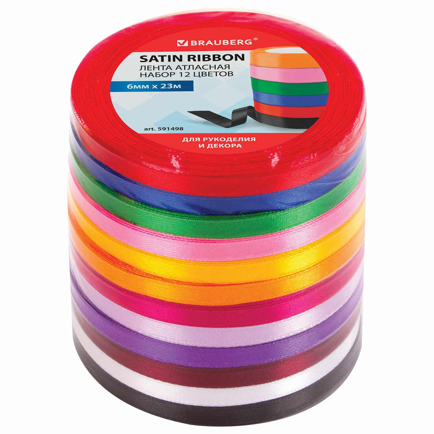 - Лента атласная ширина 6 мм, набор 12 цветов по 23 м, BRAUBERG, 591498