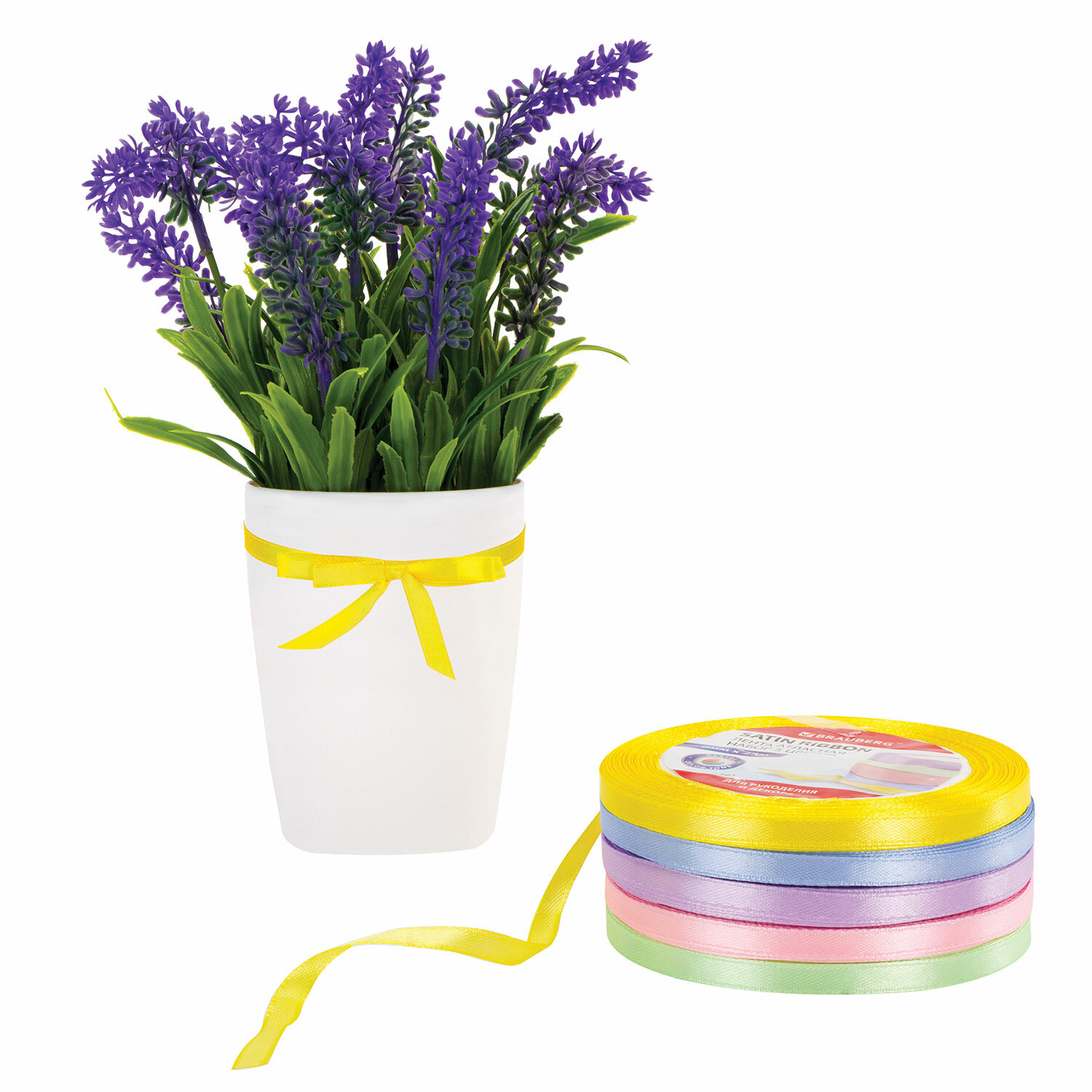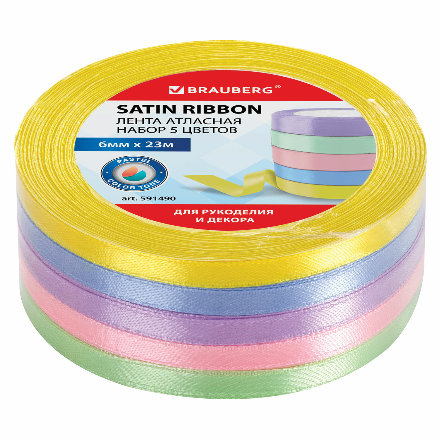 - Лента атласная ширина 6 мм, ПАСТЕЛЬ набор 5 цветов по 23 м, BRAUBERG, 591490