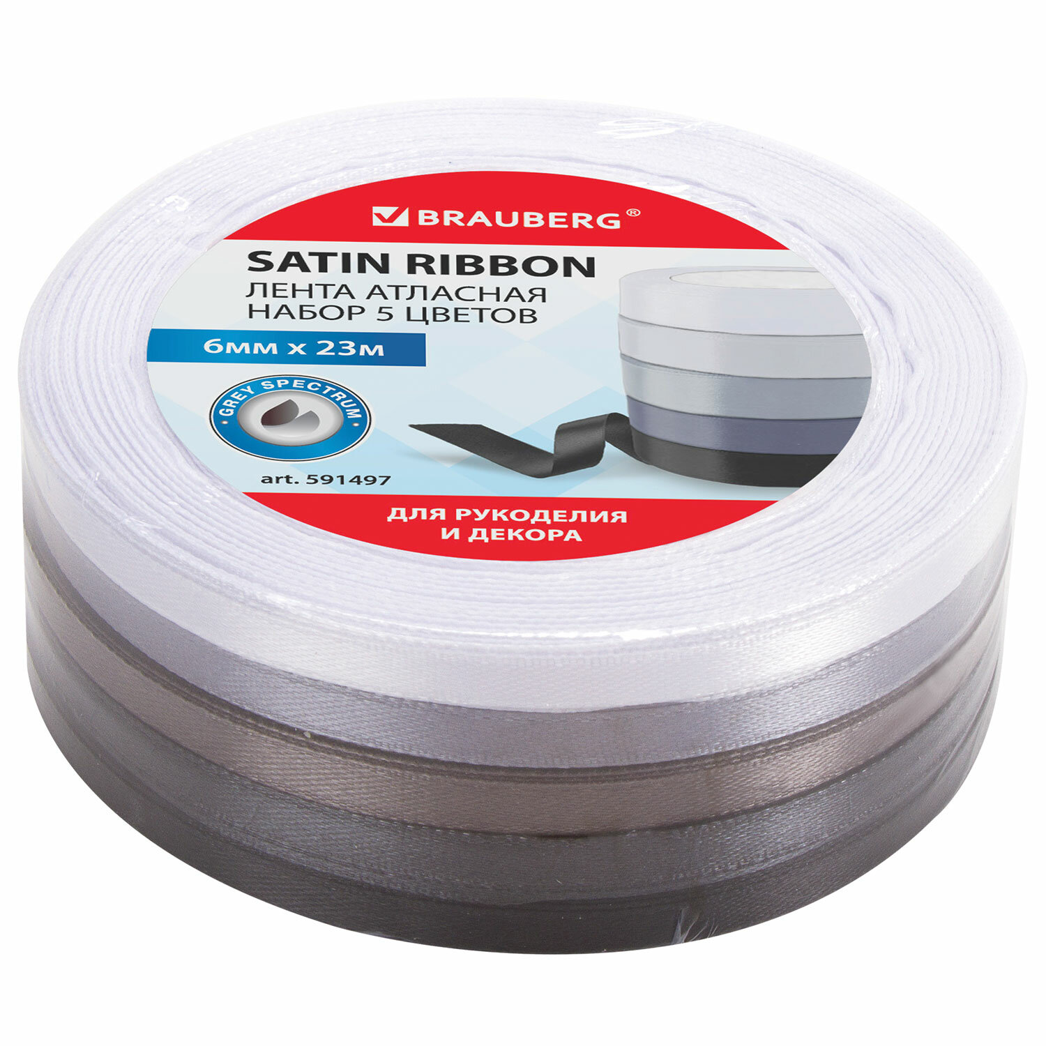 - Лента атласная ширина 6 мм, СЕРЫЙ СПЕКТР набор 5 цветов по 23 м, BRAUBERG, 591497