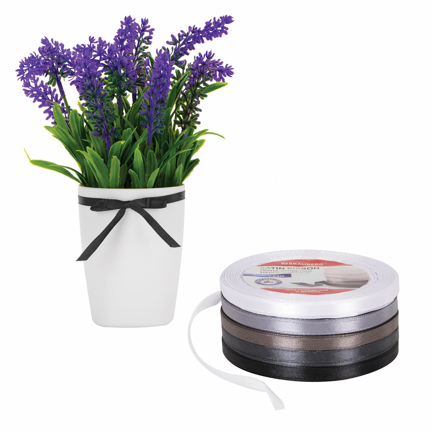 Изделие представляет собой набор из атласных лент, изготовленных из 100% полиэстера, с ткаными кромками на обоих краях. Кромка на краях лент выполнена с применением полиэстеровой нити. Ленты изготовлены с применением саржевого способа переплетения нитей. В набор входит 3 ленты серых оттенков, а также ленты белого и черного цветов. Каждая лента шириной 6 мм (± 3%) и длиной 23 м намотана на втулку из пенополистирола. Набор лент упакован в термоусадочную пленку, содержащую этикетку с краткой информацией о товаре. Лента атласная ширина 6 мм, СЕРЫЙ СПЕКТР набор 5 цветов по 23 м, BRAUBERG, 591497