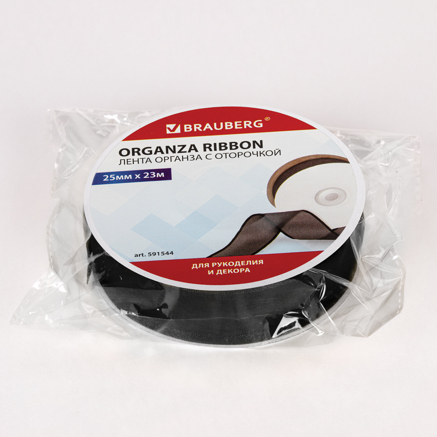Изделие представляет собой ленту из органзы черного цвета, изготовленную из 100% нейлона с атласной оторочкой с обеих сторон, ширина оторочки – 4-5 мм с каждой стороны. Выполнена с применением атласного способа переплетения нитей. Лента шириной 25 мм (± 3%) и длиной 23 м намотана на картонный рулон с пластиковой втулкой и упакована в прозрачный полипропиленовый пакет, содержащий этикетку с краткой информацией о товаре. Лента органза с оторочкой ширина 25 мм, длина 23 м, черная, BRAUBERG, 591544