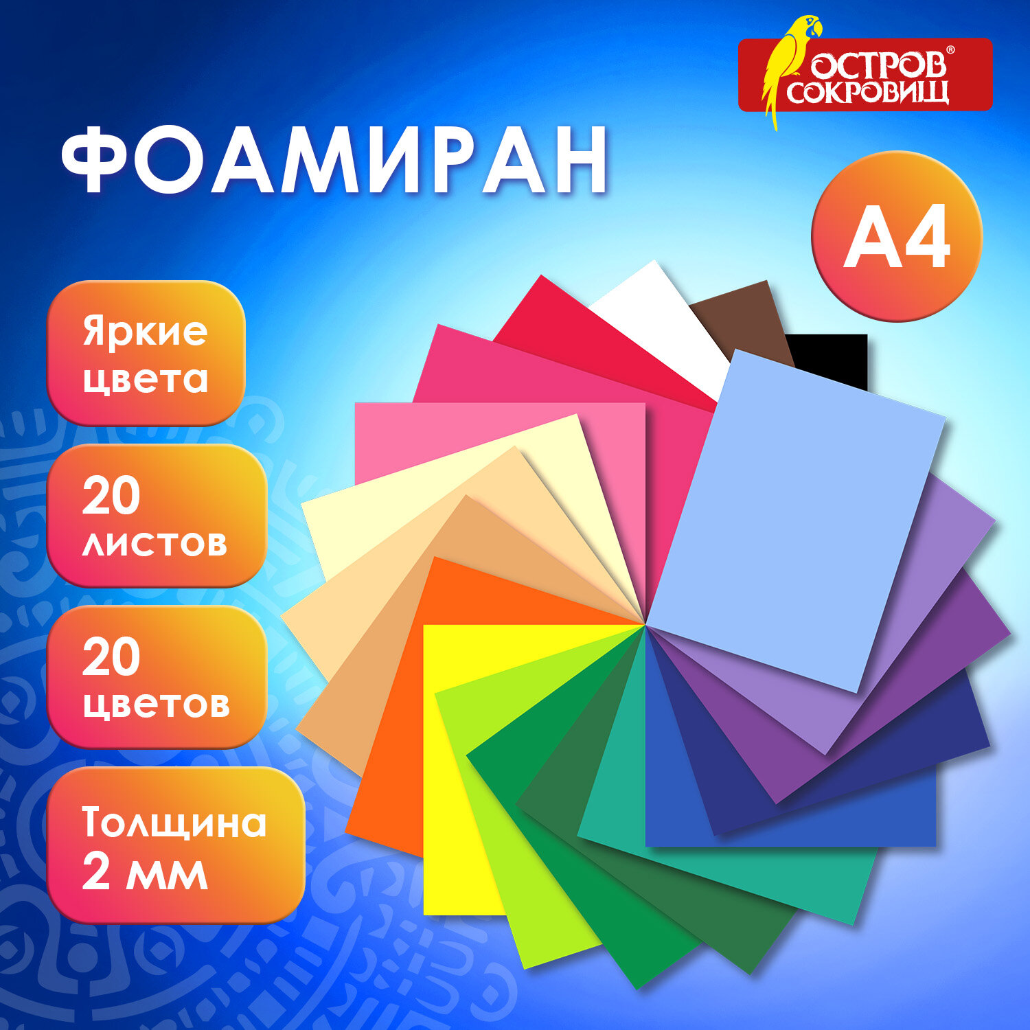 Фоамиран не токсичен, безопасен для детей. Пористая резина/фоамиран А4, 2мм, 20л, 20цв, яркие цвета, ОСТРОВ СОКРОВИЩ, 665663