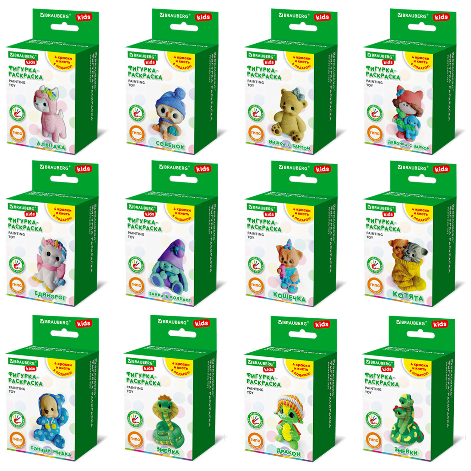 Из 14 дизайнов в транспортной упаковке находится ассорти из 12 разных фигурок без возможности выбора: альпака, совенок, мишка с бантом, девочка с зайкой, единорог, зайка в колпаке, сонный мишка, кошечка, котята, дракон, дракончики, змейки. ФИГУРКА ИЗ ГИПСА с красками и кистью для росписи, ассорти, BRAUBERG KIDS, 665203